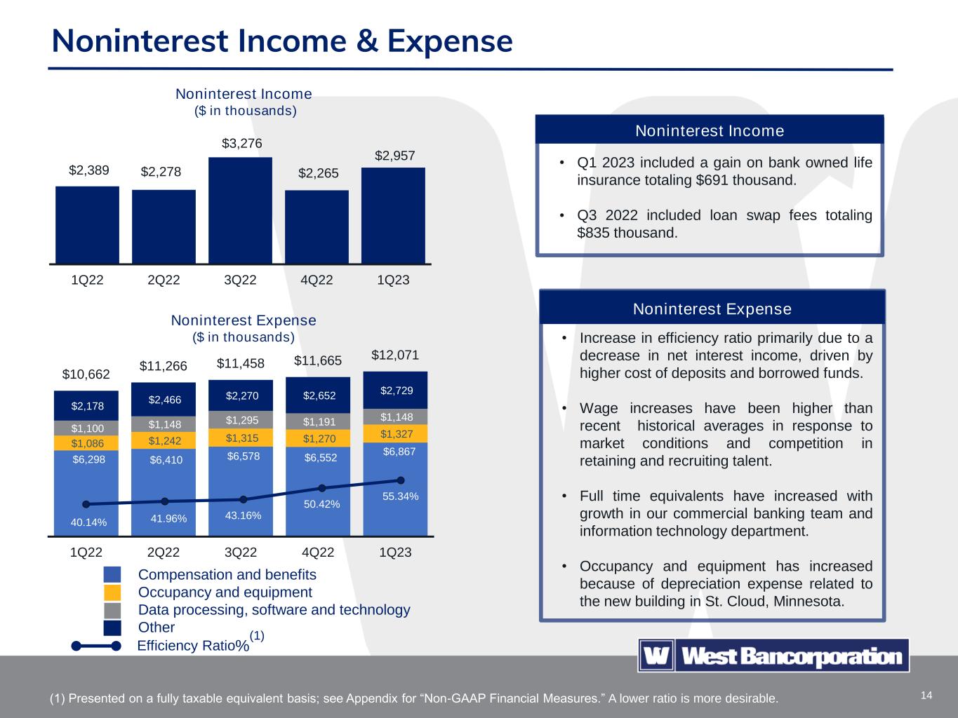 13 Net Interest Income $23.8 $24.2 $23.0 $20.7 $18.7 1Q22 2Q22 3Q22 4Q22 1Q23 Net Interest Income ($ in millions) • Loan interest income increased $2.0 million. • Deposit interest expense increased $2.3 million. • Borrowed funds interest expense increased $1.7 million. • The changes in deposit and funding mix and rising rates had a negative impact on net interest margin that exceeded the benefits of higher loan and securities yields. • Fixed rate nature of loan portfolio results in lagging repricing compared to deposits. • Large balance client base is more sensitive to rising interest rates. • Estimated investment portfolio cash flows for the next 12 months is $53.6 million with a roll-off rate of 1.87% • Scheduled fixed rate loan maturities for the next 12 months is $100.3 million with a roll-off rate of 4.52%. Net Interest Margin % (1) 2.85% 2.93% 2.78% 2.49% 2.23% Net interest margin declined 26 bps in Q1 2023 (1) Presented on a fully taxable equivalent basis; see Appendix for “Non-GAAP Financial Measures.” Net interest income decreased $2.0 million in Q1 2023 compared to Q4 2022