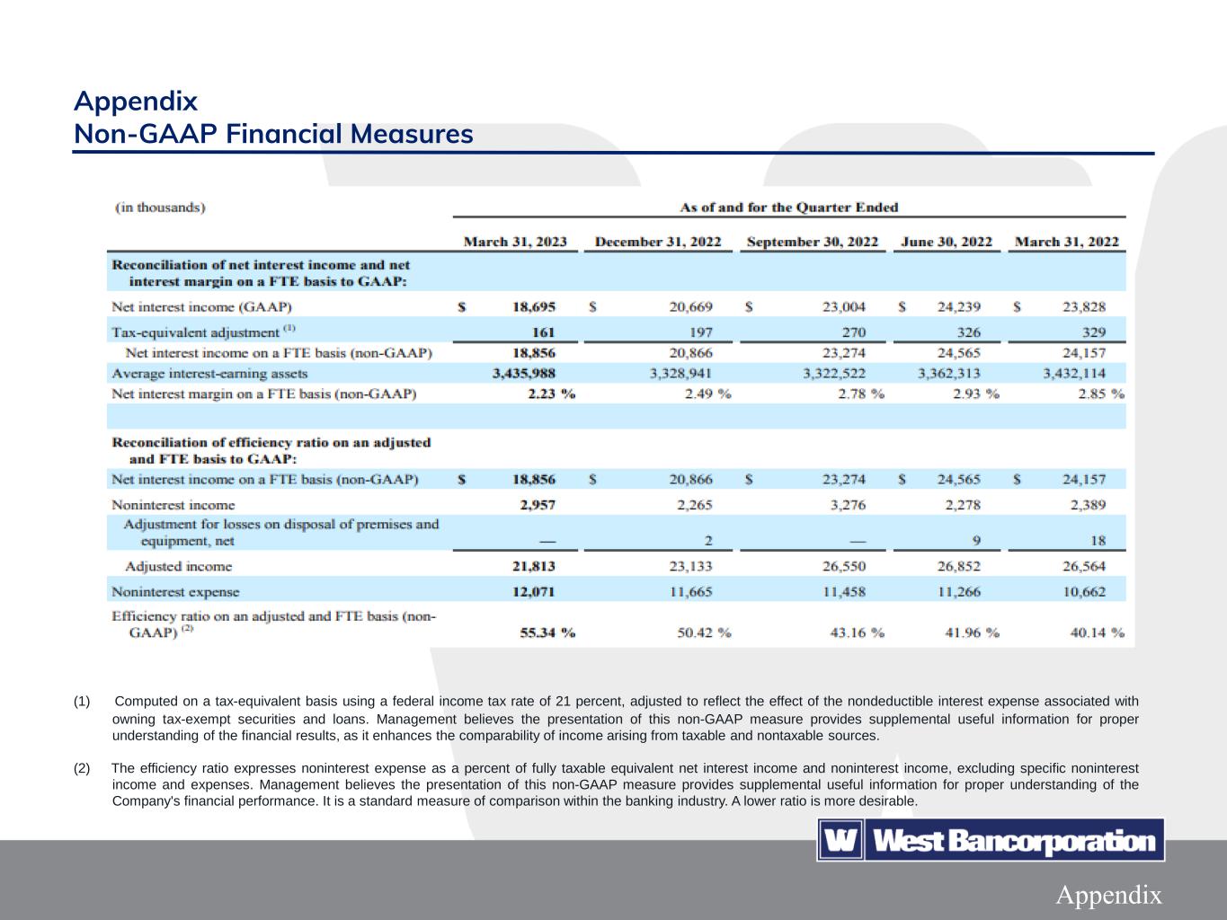 16Appendix Appendix Non-GAAP Financial Measures (1) Computed on a tax-equivalent basis using a federal income tax rate of 21 percent, adjusted to reflect the effect of the nondeductible interest expense associated with owning tax-exempt securities and loans. Management believes the presentation of this non-GAAP measure provides supplemental useful information for proper understanding of the financial results, as it enhances the comparability of income arising from taxable and nontaxable sources. (2) The efficiency ratio expresses noninterest expense as a percent of fully taxable equivalent net interest income and noninterest income, excluding specific noninterest income and expenses. Management believes the presentation of this non-GAAP measure provides supplemental useful information for proper understanding of the Company's financial performance. It is a standard measure of comparison within the banking industry. A lower ratio is more desirable.