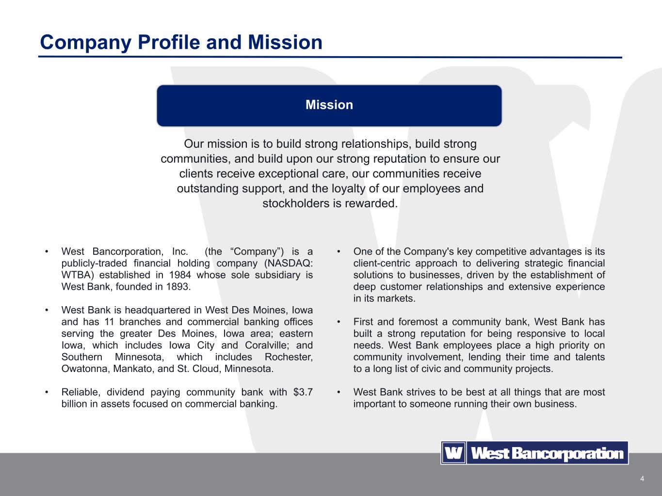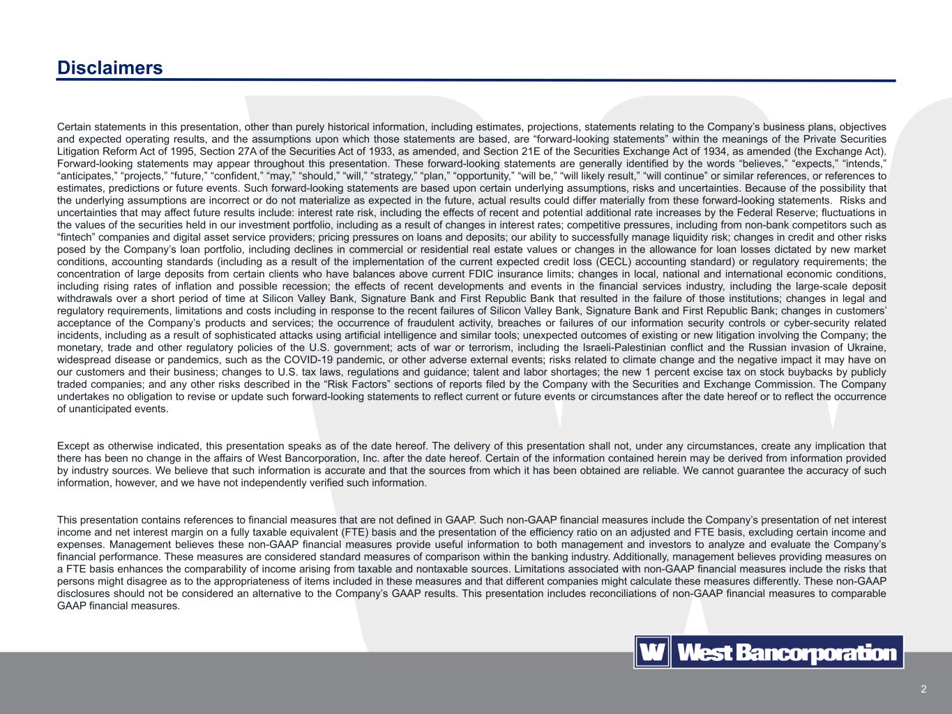 2 Certain statements in this presentation, other than purely historical information, including estimates, projections, statements relating to the Company’s business plans, objectives and expected operating results, and the assumptions upon which those statements are based, are “forward-looking statements” within the meanings of the Private Securities Litigation Reform Act of 1995, Section 27A of the Securities Act of 1933, as amended, and Section 21E of the Securities Exchange Act of 1934, as amended (the Exchange Act). Forward-looking statements may appear throughout this presentation. These forward-looking statements are generally identified by the words “believes,” “expects,” “intends,” “anticipates,” “projects,” “future,” “confident,” “may,” “should,” “will,” “strategy,” “plan,” “opportunity,” “will be,” “will likely result,” “will continue” or similar references, or references to estimates, predictions or future events. Such forward-looking statements are based upon certain underlying assumptions, risks and uncertainties. Because of the possibility that the underlying assumptions are incorrect or do not materialize as expected in the future, actual results could differ materially from these forward-looking statements. Risks and uncertainties that may affect future results include: interest rate risk, including the effects of recent and potential additional rate increases by the Federal Reserve; fluctuations in the values of the securities held in our investment portfolio, including as a result of changes in interest rates; competitive pressures, including from non-bank competitors such as “fintech” companies and digital asset service providers; pricing pressures on loans and deposits; our ability to successfully manage liquidity risk; changes in credit and other risks posed by the Company’s loan portfolio, including declines in commercial or residential real estate values or changes in the allowance for loan losses dictated by new market conditions, accounting standards (including as a result of the implementation of the current expected credit loss (CECL) accounting standard) or regulatory requirements; the concentration of large deposits from certain clients who have balances above current FDIC insurance limits; changes in local, national and international economic conditions, including rising rates of inflation and possible recession; the effects of recent developments and events in the financial services industry, including the large-scale deposit withdrawals over a short period of time at Silicon Valley Bank, Signature Bank and First Republic Bank that resulted in the failure of those institutions; changes in legal and regulatory requirements, limitations and costs including in response to the recent failures of Silicon Valley Bank, Signature Bank and First Republic Bank; changes in customers’ acceptance of the Company’s products and services; the occurrence of fraudulent activity, breaches or failures of our information security controls or cyber-security related incidents, including as a result of sophisticated attacks using artificial intelligence and similar tools; unexpected outcomes of existing or new litigation involving the Company; the monetary, trade and other regulatory policies of the U.S. government; acts of war or terrorism, including the Israeli-Palestinian conflict and the Russian invasion of Ukraine, widespread disease or pandemics, such as the COVID-19 pandemic, or other adverse external events; risks related to climate change and the negative impact it may have on our customers and their business; changes to U.S. tax laws, regulations and guidance; talent and labor shortages; the new 1 percent excise tax on stock buybacks by publicly traded companies; and any other risks described in the “Risk Factors” sections of reports filed by the Company with the Securities and Exchange Commission. The Company undertakes no obligation to revise or update such forward-looking statements to reflect current or future events or circumstances after the date hereof or to reflect the occurrence of unanticipated events. Except as otherwise indicated, this presentation speaks as of the date hereof. The delivery of this presentation shall not, under any circumstances, create any implication that there has been no change in the affairs of West Bancorporation, Inc. after the date hereof. Certain of the information contained herein may be derived from information provided by industry sources. We believe that such information is accurate and that the sources from which it has been obtained are reliable. We cannot guarantee the accuracy of such information, however, and we have not independently verified such information. This presentation contains references to financial measures that are not defined in GAAP. Such non-GAAP financial measures include the Company’s presentation of net interest income and net interest margin on a fully taxable equivalent (FTE) basis and the presentation of the efficiency ratio on an adjusted and FTE basis, excluding certain income and expenses. Management believes these non-GAAP financial measures provide useful information to both management and investors to analyze and evaluate the Company’s financial performance. These measures are considered standard measures of comparison within the banking industry. Additionally, management believes providing measures on a FTE basis enhances the comparability of income arising from taxable and nontaxable sources. Limitations associated with non-GAAP financial measures include the risks that persons might disagree as to the appropriateness of items included in these measures and that different companies might calculate these measures differently. These non-GAAP disclosures should not be considered an alternative to the Company’s GAAP results. This presentation includes reconciliations of non-GAAP financial measures to comparabl