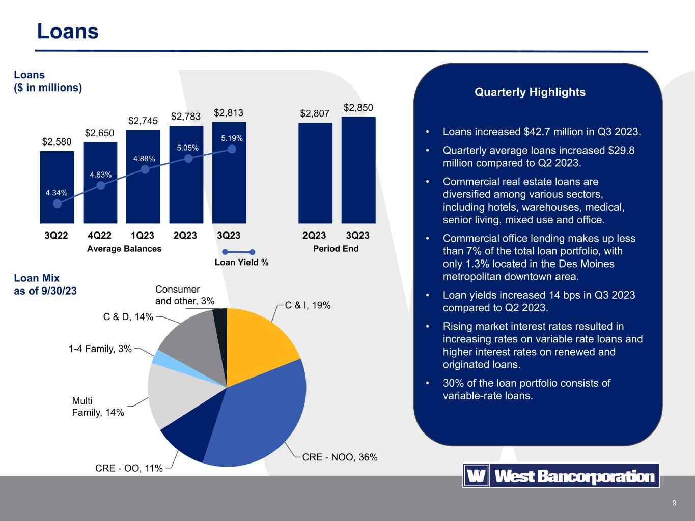 8 Company Highlights – Commitment to Excellence West Bank is a commercially-focused financial institution operating in high quality markets in Iowa and Minnesota led by a deep and experienced management team with skills developed internally and with other large regional banking institutions. Credit Culture Strategy Community Service & Philanthropy Risk Management • Strict credit risk management with robust processes and experienced credit personnel. • 31 high quality commercial bankers with an average of 22 years of commercial banking experience. • Centralized committee structure that is agile and responsive to customer needs and an organizational structure that provides deep support of credit and administrative functions. • We are a local lender to local customers. We live where we lend. • Disciplined organic growth strategy with a track record of successful lift-out strategies. • Business model highlighted by focus on risk management and consistent execution. • Superior talent with business expertise in building relationships. • In 2022, our employees volunteered over 7,000 hours of community service. • In 2022, the West Bancorporation Foundation and West Bank provided over $700,000 in total philanthropic contributions to more than 225 organizations. • Commercial real estate stress testing is completed quarterly. • No exposure to cryptocurrency companies or assets. • No commercial real estate office exposure in major metropolitan downtown areas outside of Iowa.