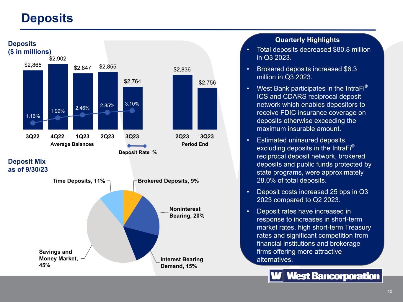 9 $2,580 $2,650 $2,745 $2,783 $2,813 $2,807 $2,850 3Q22 4Q22 1Q23 2Q23 3Q23 2Q23 3Q23 Loans • Loans increased $42.7 million in Q3 2023. • Quarterly average loans increased $29.8 million compared to Q2 2023. • Commercial real estate loans are diversified among various sectors, including hotels, warehouses, medical, senior living, mixed use and office. • Commercial office lending makes up less than 7% of the total loan portfolio, with only 1.3% located in the Des Moines metropolitan downtown area. • Loan yields increased 14 bps in Q3 2023 compared to Q2 2023. • Rising market interest rates resulted in increasing rates on variable rate loans and higher interest rates on renewed and originated loans. • 30% of the loan portfolio consists of variable-rate loans. Quarterly Highlights C & I, 19% CRE - NOO, 36% CRE - OO, 11% Multi Family, 14% 1-4 Family, 3% C & D, 14% Consumer and other, 3% Loan Mix as of 9/30/23 4.34% 4.63% 4.88% 5.05% 5.19% Loans ($ in millions) Average Balances Period End Loan Yield %