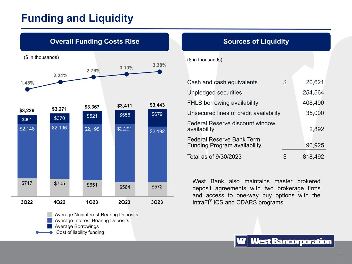 10 Deposits • Total deposits decreased $80.8 million in Q3 2023. • Brokered deposits increased $6.3 million in Q3 2023. • West Bank participates in the IntraFi® ICS and CDARS reciprocal deposit network which enables depositors to receive FDIC insurance coverage on deposits otherwise exceeding the maximum insurable amount. • Estimated uninsured deposits, excluding deposits in the IntraFi® reciprocal deposit network, brokered deposits and public funds protected by state programs, were approximately 28.0% of total deposits. • Deposit costs increased 25 bps in Q3 2023 compared to Q2 2023. • Deposit rates have increased in response to increases in short-term market rates, high short-term Treasury rates and significant competition from financial institutions and brokerage firms offering more attractive alternatives. Quarterly Highlights $2,865 $2,902 $2,847 $2,855 $2,764 $2,836 $2,756 3Q22 4Q22 1Q23 2Q23 3Q23 2Q23 3Q23 Average Balances Deposit Rate % Period End Deposits ($ in millions) 1.16% 1.99% 2.46% 2.85% 3.10% Brokered Deposits, 9% Noninterest Bearing, 20% Interest Bearing Demand, 15% Savings and Money Market, 45% Time Deposits, 11% Deposit Mix as of 9/30/23