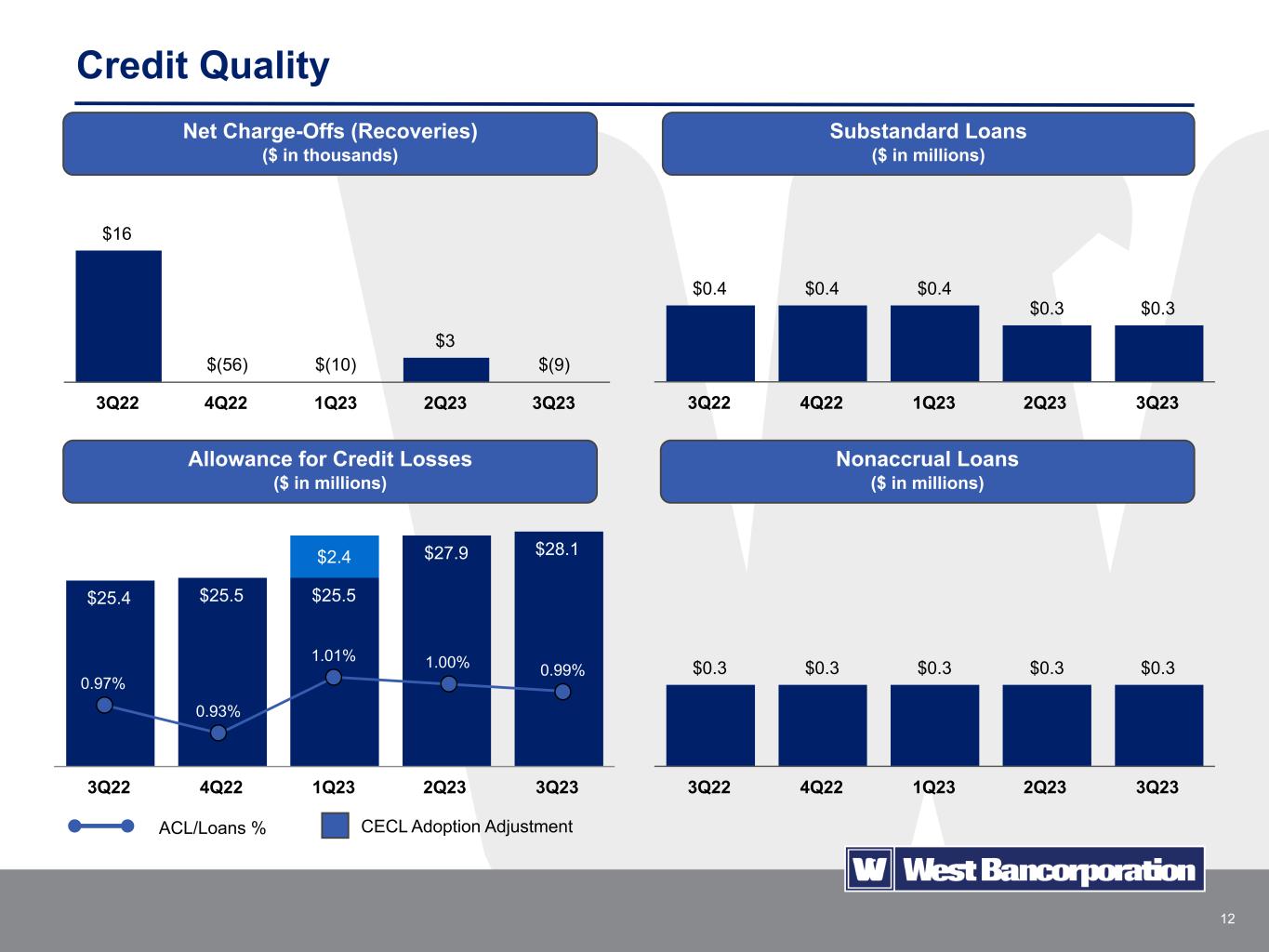 11 Funding and Liquidity Cost of liability funding ($ in thousands) Cash and cash equivalents $ 20,621 Unpledged securities 254,564 FHLB borrowing availability 408,490 Unsecured lines of credit availability 35,000 Federal Reserve discount window availability 2,892 Federal Reserve Bank Term Funding Program availability 96,925 Total as of 9/30/2023 $ 818,492 $3,226 $3,271 $3,367 $3,411 $3,443 $717 $705 $651 $564 $572 $2,148 $2,196 $2,195 $2,291 $2,192 $361 $370 $521 $556 $679 Average Noninterest-Bearing Deposits Average Interest Bearing Deposits Average Borrowings 3Q22 4Q22 1Q23 2Q23 3Q23 1.45% 2.24% 2.76% 3.10% 3.38% Overall Funding Costs Rise Sources of Liquidity West Bank also maintains master brokered deposit agreements with two brokerage firms and access to one-way buy options with the IntraFi® ICS and CDARS programs. ($ in thousands)