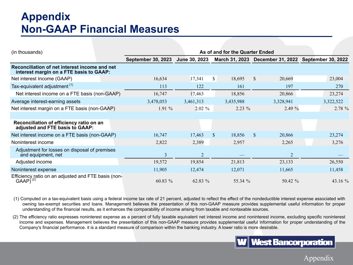 15Appendix Appendix Non-GAAP Financial Measures (in thousands) As of and for the Quarter Ended September 30, 2023 June 30, 2023 March 31, 2023 December 31, 2022 September 30, 2022 Reconciliation of net interest income and net interest margin on a FTE basis to GAAP: Net interest Income (GAAP) 16,634 17,341 $ 18,695 $ 20,669 23,004 Tax-equivalent adjustment (1) 113 122 161 197 270 Net interest income on a FTE basis (non-GAAP) 16,747 17,463 18,856 20,866 23,274 Average interest-earning assets 3,478,053 3,461,313 3,435,988 3,328,941 3,322,522 Net interest margin on a FTE basis (non-GAAP) 1.91 % 2.02 % 2.23 % 2.49 % 2.78 % Reconciliation of efficiency ratio on an adjusted and FTE basis to GAAP: Net interest income on a FTE basis (non-GAAP) 16,747 17,463 $ 18,856 $ 20,866 23,274 Noninterest income 2,822 2,389 2,957 2,265 3,276 Adjustment for losses on disposal of premises and equipment, net 3 2 — 2 — Adjusted income 19,572 19,854 21,813 23,133 26,550 Noninterest expense 11,905 12,474 12,071 11,665 11,458 Efficiency ratio on an adjusted and FTE basis (non- GAAP) (2) 60.83 % 62.83 % 55.34 % 50.42 % 43.16 % (1) Computed on a tax-equivalent basis using a federal income tax rate of 21 percent, adjusted to reflect the effect of the nondeductible interest expense associated with owning tax-exempt securities and loans. Management believes the presentation of this non-GAAP measure provides supplemental useful information for proper understanding of the financial results, as it enhances the comparability of income arising from taxable and nontaxable sources. (2) The efficiency ratio expresses noninterest expense as a percent of fully taxable equivalent net interest income and noninterest income, excluding specific noninterest income and expenses. Management believes the presentation of this non-GAAP measure provides supplemental useful information for proper understanding of the Company's financial performance. it is a standard measure of comparison within the banking industry. A lower ratio is more desirable.