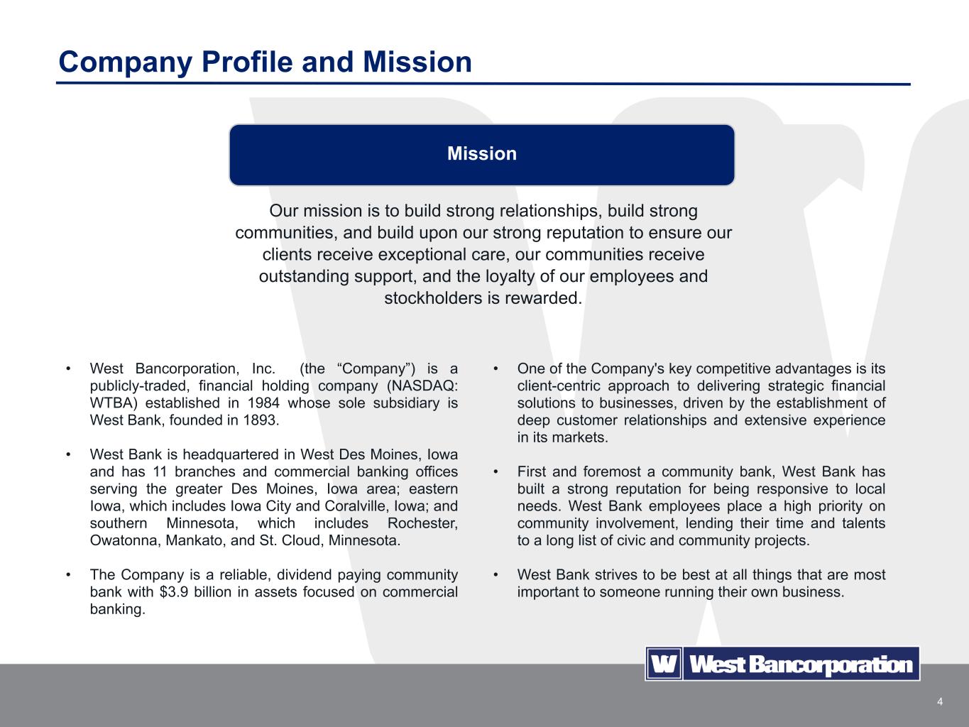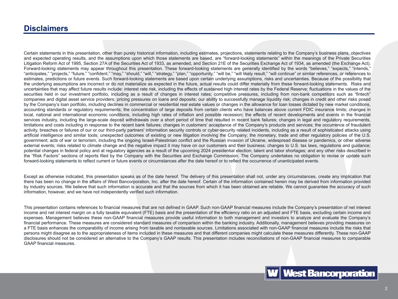 2 Certain statements in this presentation, other than purely historical information, including estimates, projections, statements relating to the Company’s business plans, objectives and expected operating results, and the assumptions upon which those statements are based, are “forward-looking statements” within the meanings of the Private Securities Litigation Reform Act of 1995, Section 27A of the Securities Act of 1933, as amended, and Section 21E of the Securities Exchange Act of 1934, as amended (the Exchange Act). Forward-looking statements may appear throughout this presentation. These forward-looking statements are generally identified by the words “believes,” “expects,” “intends,” “anticipates,” “projects,” “future,” “confident,” “may,” “should,” “will,” “strategy,” “plan,” “opportunity,” “will be,” “will likely result,” “will continue” or similar references, or references to estimates, predictions or future events. Such forward-looking statements are based upon certain underlying assumptions, risks and uncertainties. Because of the possibility that the underlying assumptions are incorrect or do not materialize as expected in the future, actual results could differ materially from these forward-looking statements. Risks and uncertainties that may affect future results include: interest rate risk, including the effects of sustained high interest rates by the Federal Reserve; fluctuations in the values of the securities held in our investment portfolio, including as a result of changes in interest rates; competitive pressures, including from non-bank competitors such as “fintech” companies and digital asset service providers; pricing pressures on loans and deposits; our ability to successfully manage liquidity risk; changes in credit and other risks posed by the Company’s loan portfolio, including declines in commercial or residential real estate values or changes in the allowance for loan losses dictated by new market conditions, accounting standards or regulatory requirements; the concentration of large deposits from certain clients who have balances above current FDIC insurance limits; changes in local, national and international economic conditions, including high rates of inflation and possible recession; the effects of recent developments and events in the financial services industry, including the large-scale deposit withdrawals over a short period of time that resulted in recent bank failures; changes in legal and regulatory requirements, limitations and costs including in response to the recent bank failures; changes in customers’ acceptance of the Company’s products and services; the occurrence of fraudulent activity, breaches or failures of our or our third-party partners' information security controls or cyber-security related incidents, including as a result of sophisticated attacks using artificial intelligence and similar tools; unexpected outcomes of existing or new litigation involving the Company; the monetary, trade and other regulatory policies of the U.S. government; acts of war or terrorism, including the ongoing Israeli-Palestinian conflict and the Russian invasion of Ukraine, widespread disease or pandemics, or other adverse external events; risks related to climate change and the negative impact it may have on our customers and their business; changes to U.S. tax laws, regulations and guidance; potential changes in federal policy and at regulatory agencies as a result of the upcoming 2024 presidential election; talent and labor shortages; and any other risks described in the “Risk Factors” sections of reports filed by the Company with the Securities and Exchange Commission. The Company undertakes no obligation to revise or update such forward-looking statements to reflect current or future events or circumstances after the date hereof or to reflect the occurrence of unanticipated events. Except as otherwise indicated, this presentation speaks as of the date hereof. The delivery of this presentation shall not, under any circumstances, create any implication that there has been no change in the affairs of West Bancorporation, Inc. after the date hereof. Certain of the information contained herein may be derived from information provided by industry sources. We believe that such information is accurate and that the sources from which it has been obtained are reliable. We cannot guarantee the accuracy of such information, however, and we have not independently verified such information. This presentation contains references to financial measures that are not defined in GAAP. Such non-GAAP financial measures include the Company’s presentation of net interest income and net interest margin on a fully taxable equivalent (FTE) basis and the presentation of the efficiency ratio on an adjusted and FTE basis, excluding certain income and expenses. Management believes these non-GAAP financial measures provide useful information to both management and investors to analyze and evaluate the Company’s financial performance. These measures are considered standard measures of comparison within the banking industry. Additionally, management believes providing measures on a FTE basis enhances the comparability of income arising from taxable and nontaxable sources. Limitations associated with non-GAAP financial measures include the risks that persons might disagree as to the appropriateness of items included in these measures and that different companies might calculate these measures differently. These non-GAAP disclosures should not be considered an alternative to the Company’s GAAP results. This presentation includes reconciliations of non-GAAP financial measures to comparable GAAP financial measures. Disclaimers