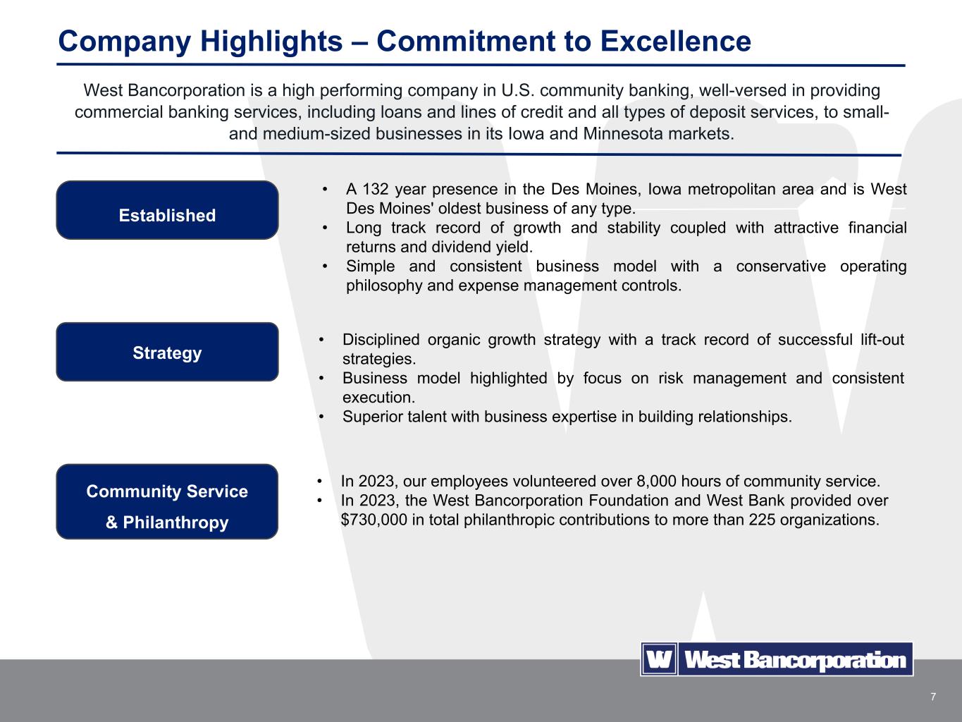 6 Conservative Organic Growth with Successful Lift-Out Strategies David Nelson joins West Bank as CEO. Entered the Rochester, Minnesota market by hiring experienced bankers who had existing strong relationships with local business owners and creating an advisory community board made up of local business owners and leaders. Constructed a bank office building in Rochester, Minnesota. Crossed $2 billion in total assets. Expanded into St. Cloud, Mankato, and Owatonna, Minnesota with the same lift- out strategy used in Rochester, Minnesota. Crossed $3 billion in total assets. Opened a newly constructed bank office building in St. Cloud, Minnesota. Opened a newly constructed bank office building in Mankato, Minnesota and began construction on a bank office building in Owatonna, Minnesota. Opened new corporate headquarters building in West Des Moines, Iowa in April 2024. After being in the same leased space for fifty years, the new building consolidates our operations under one roof, and provides space for future growth and enhanced business development opportunities. 2010 2013 2016 2018 2019 2020 2022 2023 2024