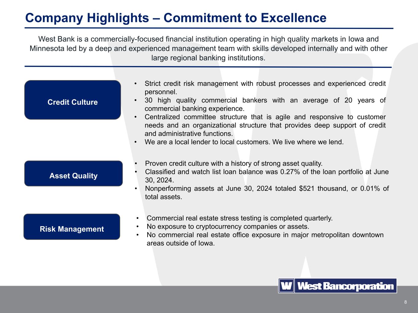 7 Company Highlights – Commitment to Excellence West Bancorporation is a high performing company in U.S. community banking, well-versed in providing commercial banking services, including loans and lines of credit and all types of deposit services, to small- and medium-sized businesses in its Iowa and Minnesota markets. Established • A 132 year presence in the Des Moines, Iowa metropolitan area and is West Des Moines' oldest business of any type. • Long track record of growth and stability coupled with attractive financial returns and dividend yield. • Simple and consistent business model with a conservative operating philosophy and expense management controls. Strategy • Disciplined organic growth strategy with a track record of successful lift-out strategies. • Business model highlighted by focus on risk management and consistent execution. • Superior talent with business expertise in building relationships. Community Service & Philanthropy • In 2023, our employees volunteered over 8,000 hours of community service. • In 2023, the West Bancorporation Foundation and West Bank provided over $730,000 in total philanthropic contributions to more than 225 organizations.