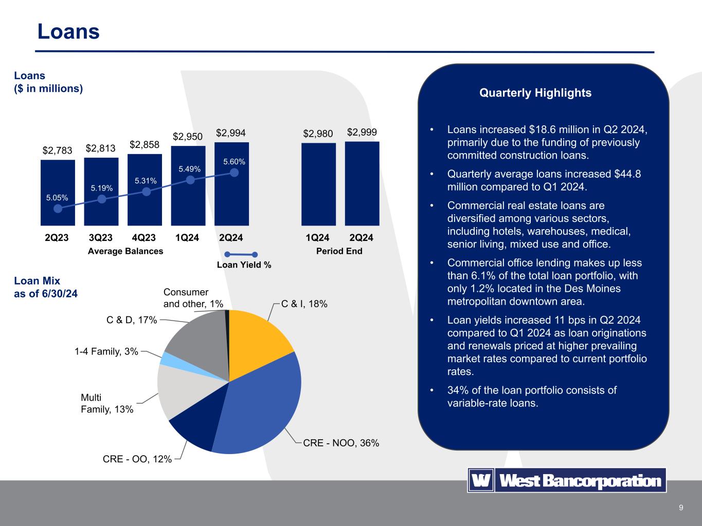 8 Company Highlights – Commitment to Excellence West Bank is a commercially-focused financial institution operating in high quality markets in Iowa and Minnesota led by a deep and experienced management team with skills developed internally and with other large regional banking institutions. Credit Culture Risk Management • Strict credit risk management with robust processes and experienced credit personnel. • 30 high quality commercial bankers with an average of 20 years of commercial banking experience. • Centralized committee structure that is agile and responsive to customer needs and an organizational structure that provides deep support of credit and administrative functions. • We are a local lender to local customers. We live where we lend. • Commercial real estate stress testing is completed quarterly. • No exposure to cryptocurrency companies or assets. • No commercial real estate office exposure in major metropolitan downtown areas outside of Iowa. Asset Quality • Proven credit culture with a history of strong asset quality. • Classified and watch list loan balance was 0.27% of the loan portfolio at June 30, 2024. • Nonperforming assets at June 30, 2024 totaled $521 thousand, or 0.01% of total assets.
