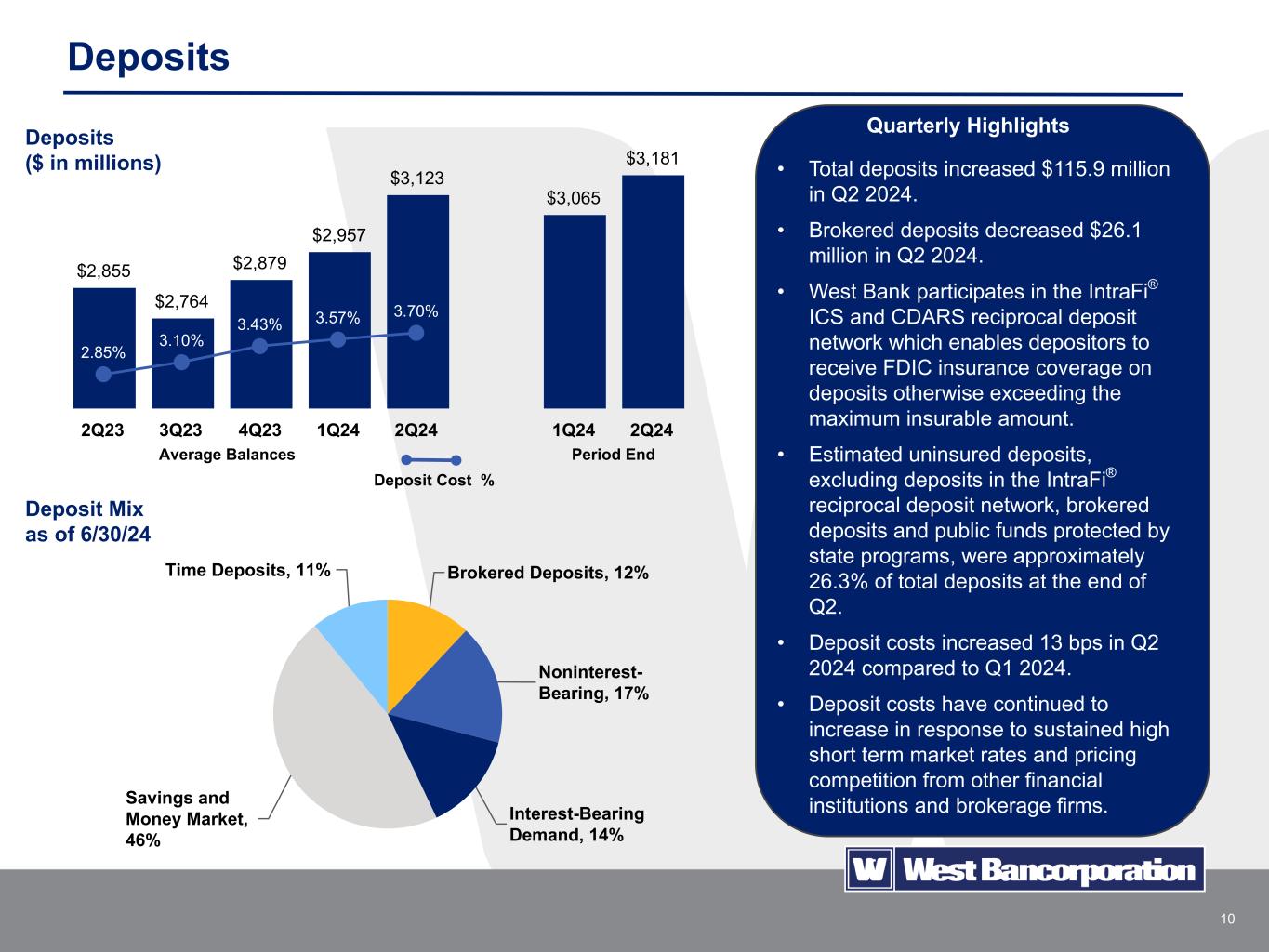 9 $2,783 $2,813 $2,858 $2,950 $2,994 $2,980 $2,999 2Q23 3Q23 4Q23 1Q24 2Q24 1Q24 2Q24 Loans • Loans increased $18.6 million in Q2 2024, primarily due to the funding of previously committed construction loans. • Quarterly average loans increased $44.8 million compared to Q1 2024. • Commercial real estate loans are diversified among various sectors, including hotels, warehouses, medical, senior living, mixed use and office. • Commercial office lending makes up less than 6.1% of the total loan portfolio, with only 1.2% located in the Des Moines metropolitan downtown area. • Loan yields increased 11 bps in Q2 2024 compared to Q1 2024 as loan originations and renewals priced at higher prevailing market rates compared to current portfolio rates. • 34% of the loan portfolio consists of variable-rate loans. Quarterly Highlights C & I, 18% CRE - NOO, 36% CRE - OO, 12% Multi Family, 13% 1-4 Family, 3% C & D, 17% Consumer and other, 1% Loan Mix as of 6/30/24 5.05% 5.19% 5.31% 5.49% 5.60% Loans ($ in millions) Average Balances Period End Loan Yield %