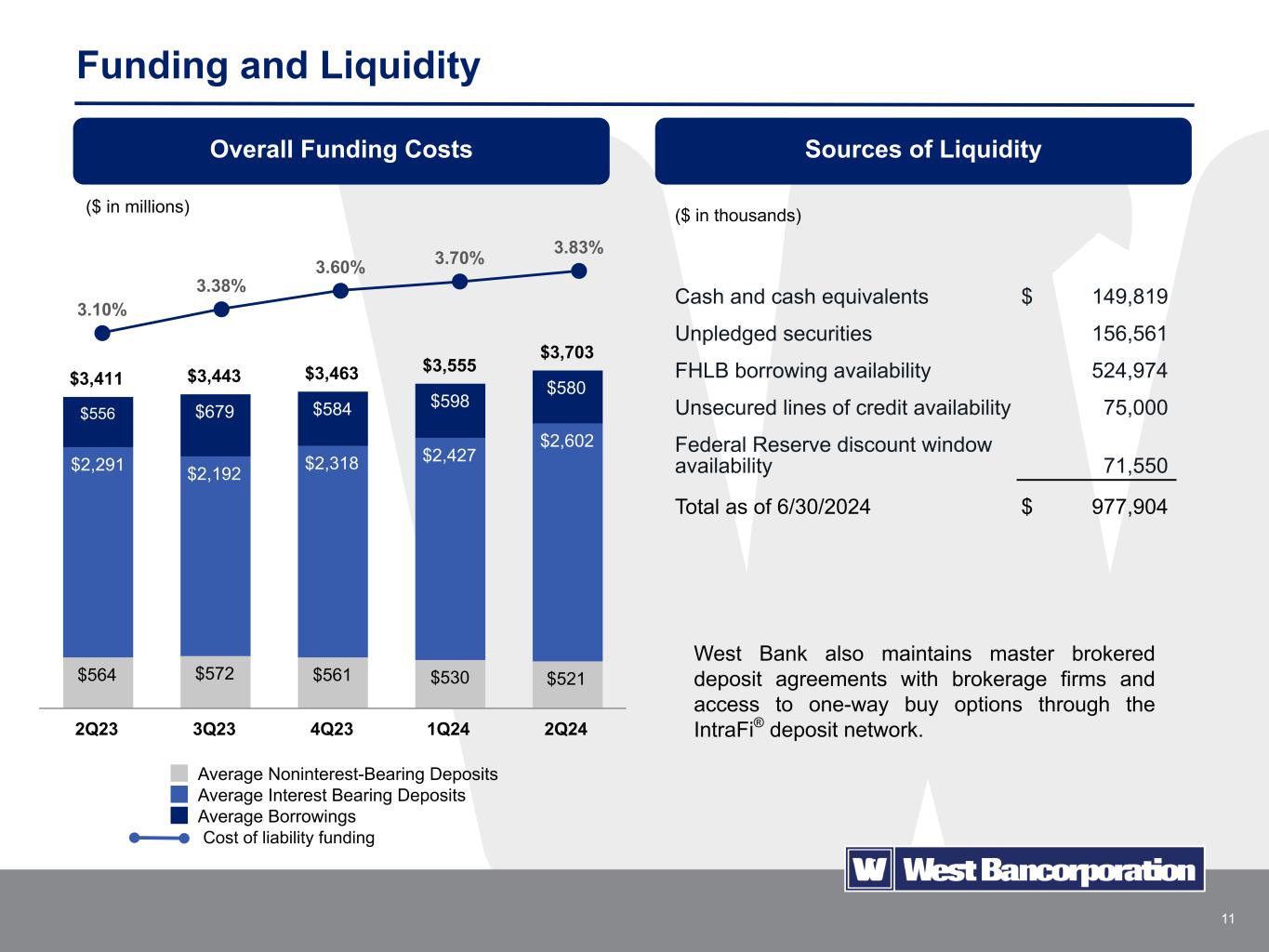 10 Deposits • Total deposits increased $115.9 million in Q2 2024. • Brokered deposits decreased $26.1 million in Q2 2024. • West Bank participates in the IntraFi® ICS and CDARS reciprocal deposit network which enables depositors to receive FDIC insurance coverage on deposits otherwise exceeding the maximum insurable amount. • Estimated uninsured deposits, excluding deposits in the IntraFi® reciprocal deposit network, brokered deposits and public funds protected by state programs, were approximately 26.3% of total deposits at the end of Q2. • Deposit costs increased 13 bps in Q2 2024 compared to Q1 2024. • Deposit costs have continued to increase in response to sustained high short term market rates and pricing competition from other financial institutions and brokerage firms. Quarterly Highlights $2,855 $2,764 $2,879 $2,957 $3,123 $3,065 $3,181 2Q23 3Q23 4Q23 1Q24 2Q24 1Q24 2Q24 Average Balances Deposit Cost % Period End Deposits ($ in millions) 2.85% 3.10% 3.43% 3.57% 3.70% Brokered Deposits, 12% Noninterest- Bearing, 17% Interest-Bearing Demand, 14% Savings and Money Market, 46% Time Deposits, 11% Deposit Mix as of 6/30/24