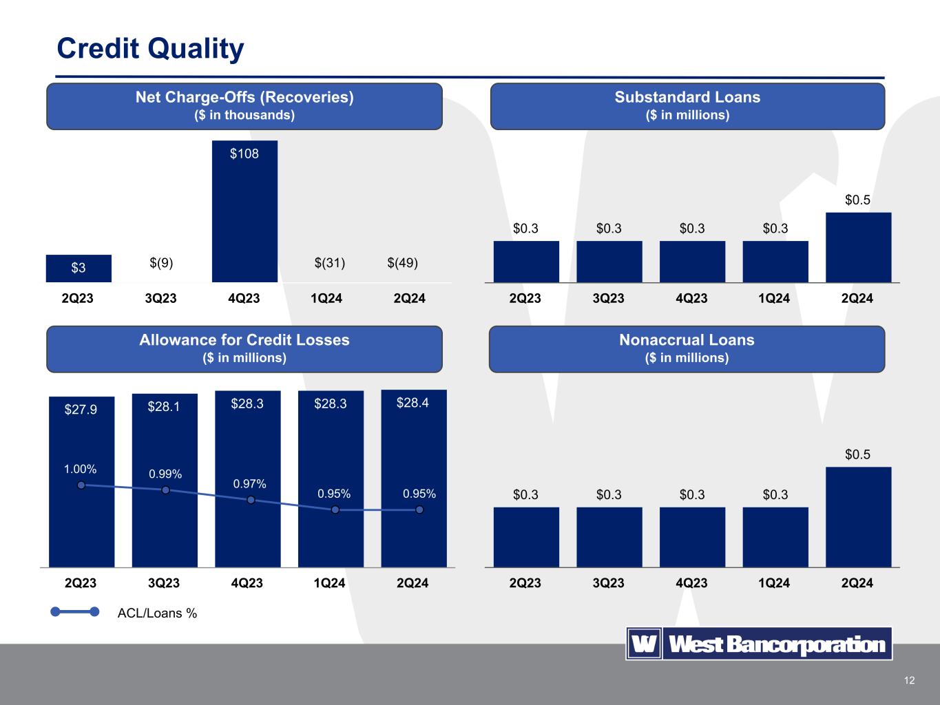 11 Funding and Liquidity Cost of liability funding ($ in thousands) Cash and cash equivalents $ 149,819 Unpledged securities 156,561 FHLB borrowing availability 524,974 Unsecured lines of credit availability 75,000 Federal Reserve discount window availability 71,550 Total as of 6/30/2024 $ 977,904 $3,411 $3,443 $3,463 $3,555 $3,703 $564 $572 $561 $530 $521 $2,291 $2,192 $2,318 $2,427 $2,602 $556 $679 $584 $598 $580 Average Noninterest-Bearing Deposits Average Interest Bearing Deposits Average Borrowings 2Q23 3Q23 4Q23 1Q24 2Q24 3.10% 3.38% 3.60% 3.70% 3.83% Overall Funding Costs Sources of Liquidity West Bank also maintains master brokered deposit agreements with brokerage firms and access to one-way buy options through the IntraFi® deposit network. ($ in millions)