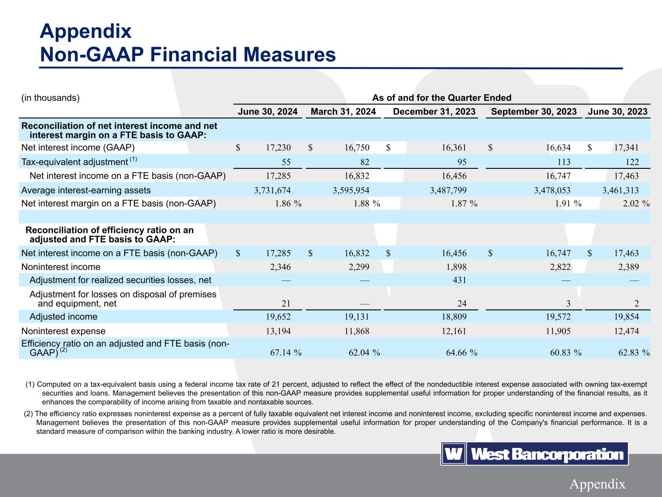 15Appendix Appendix Non-GAAP Financial Measures (in thousands) As of and for the Quarter Ended June 30, 2024 March 31, 2024 December 31, 2023 September 30, 2023 June 30, 2023 Reconciliation of net interest income and net interest margin on a FTE basis to GAAP: Net interest income (GAAP) $ 17,230 $ 16,750 $ 16,361 $ 16,634 $ 17,341 Tax-equivalent adjustment (1) 55 82 95 113 122 Net interest income on a FTE basis (non-GAAP) 17,285 16,832 16,456 16,747 17,463 Average interest-earning assets 3,731,674 3,595,954 3,487,799 3,478,053 3,461,313 Net interest margin on a FTE basis (non-GAAP) 1.86 % 1.88 % 1.87 % 1.91 % 2.02 % Reconciliation of efficiency ratio on an adjusted and FTE basis to GAAP: Net interest income on a FTE basis (non-GAAP) $ 17,285 $ 16,832 $ 16,456 $ 16,747 $ 17,463 Noninterest income 2,346 2,299 1,898 2,822 2,389 Adjustment for realized securities losses, net — — 431 — — Adjustment for losses on disposal of premises and equipment, net 21 — 24 3 2 Adjusted income 19,652 19,131 18,809 19,572 19,854 Noninterest expense 13,194 11,868 12,161 11,905 12,474 Efficiency ratio on an adjusted and FTE basis (non- GAAP) (2) 67.14 % 62.04 % 64.66 % 60.83 % 62.83 % (1) Computed on a tax-equivalent basis using a federal income tax rate of 21 percent, adjusted to reflect the effect of the nondeductible interest expense associated with owning tax-exempt securities and loans. Management believes the presentation of this non-GAAP measure provides supplemental useful information for proper understanding of the financial results, as it enhances the comparability of income arising from taxable and nontaxable sources. (2) The efficiency ratio expresses noninterest expense as a percent of fully taxable equivalent net interest income and noninterest income, excluding specific noninterest income and expenses. Management believes the presentation of this non-GAAP measure provides supplemental useful information for proper understanding of the Company's financial performance. It is a standard measure of comparison within the banking industry. A lower ratio is more desirable.