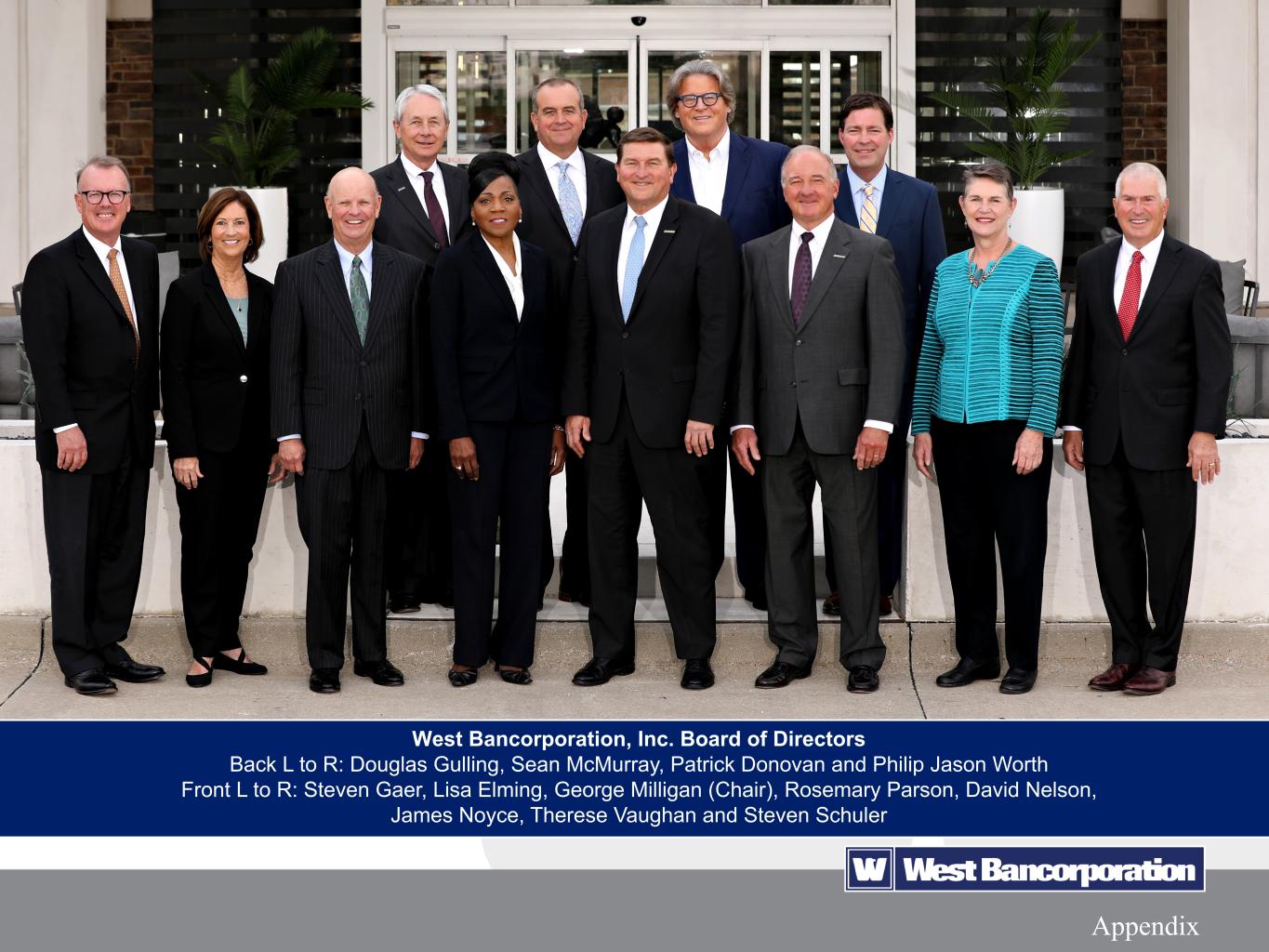 16 Third Quarter 2022 Earnings Highlights October 27, 2022 Appendix West Bancorporation, Inc. Board of Directors Back L to R: Douglas Gulling, Sean McMurray, Patrick Donovan and Philip Jason Worth Front L to R: Steven Gaer, Lisa Elming, George Milligan (Chair), Rosemary Parson, David Nelson, James Noyce, Therese Vaughan and Steven Schuler