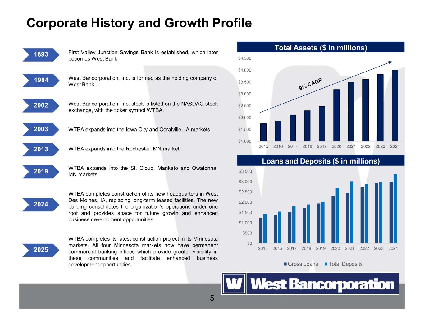 Summary Financial Highlights (Q1 2025) Geographic Presence • West Bancorporation, Inc. is a publicly-traded financial holding company (NASDAQ: WTBA) established in 1984 whose sole subsidiary is West Bank, founded in 1893. • WTBA is a strong performing company in U.S. community banking, well-versed in providing commercial banking services, including loans and lines of credit and all types of deposit and treasury management services to small and medium-sized businesses and business owners in its Iowa and Minnesota markets. • One of the Company’s key competitive advantages is its client-centric approach to delivering strategic financial solutions for businesses, driven by the establishment of deep customer relationships and delivery of exceptional customer service. • Total Assets: • Gross Loans: • Total Deposits: • Total Equity: • Market Capitalization: • Return on Avg. Assets:2 • Return on Avg. Equity: 2 • Net Interest Margin: 1,2 • Efficiency Ratio: 1 • NPAs / Assets: • Total RBC Ratio: $4.0 billion $3.0 billion $3.3 billion $238 million $337 million 0.81% 13.84% 2.28% 56.37% 0.00% 12.18% 1) Presented on an FTE basis; see Appendix for “Reconciliation of Non-GAAP Financial Measures“ 2) Q1 2025 ratio is annualized Overview of West Bancorporation, Inc. (WTBA) 4 Minneapolis OwatonnaMankato