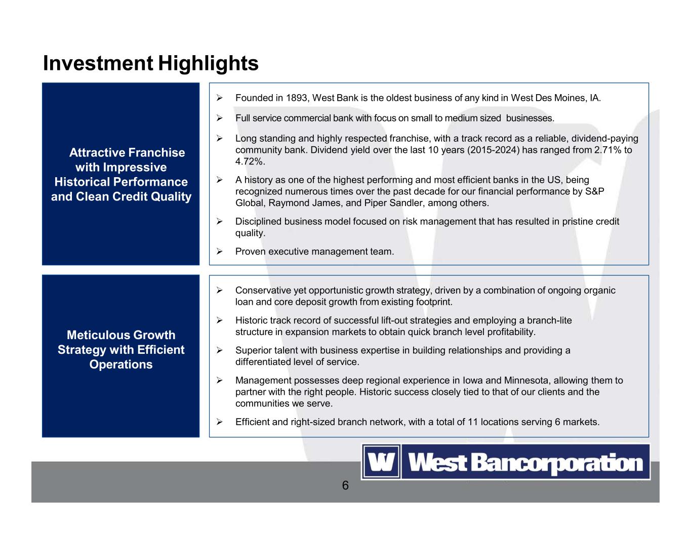 Corporate History and Growth Profile 5 1893 1984 2002 2003 2013 First Valley Junction Savings Bank is established, which later becomes West Bank. West Bancorporation, Inc. is formed as the holding company of West Bank. West Bancorporation, Inc. stock is listed on the NASDAQ stock exchange, with the ticker symbol WTBA. WTBA expands into the Iowa City and Coralville, IA markets. WTBA expands into the Rochester, MN market. WTBA expands into the St. Cloud, Mankato and Owatonna, MN markets. WTBA completes construction of its new headquarters in West Des Moines, IA, replacing long-term leased facilities. The new building consolidates the organization’s operations under one roof and provides space for future growth and enhanced business development opportunities. WTBA completes its latest construction project in its Minnesota markets. All four Minnesota markets now have permanent commercial banking offices which provide greater visibility in these communities and facilitate enhanced business development opportunities. 2019 2024 2025 $1,000 $1,500 $2,000 $2,500 $3,000 $3,500 $4,000 $4,500 2015 2016 2017 2018 2019 2020 2021 2022 2023 2024 Total Assets ($ in millions) Loans and Deposits ($ in millions) $0 $500 $1,000 $1,500 $2,000 $2,500 $3,000 $3,500 2015 2016 2017 2018 2019 2020 2021 2022 2023 2024 Gross Loans Total Deposits