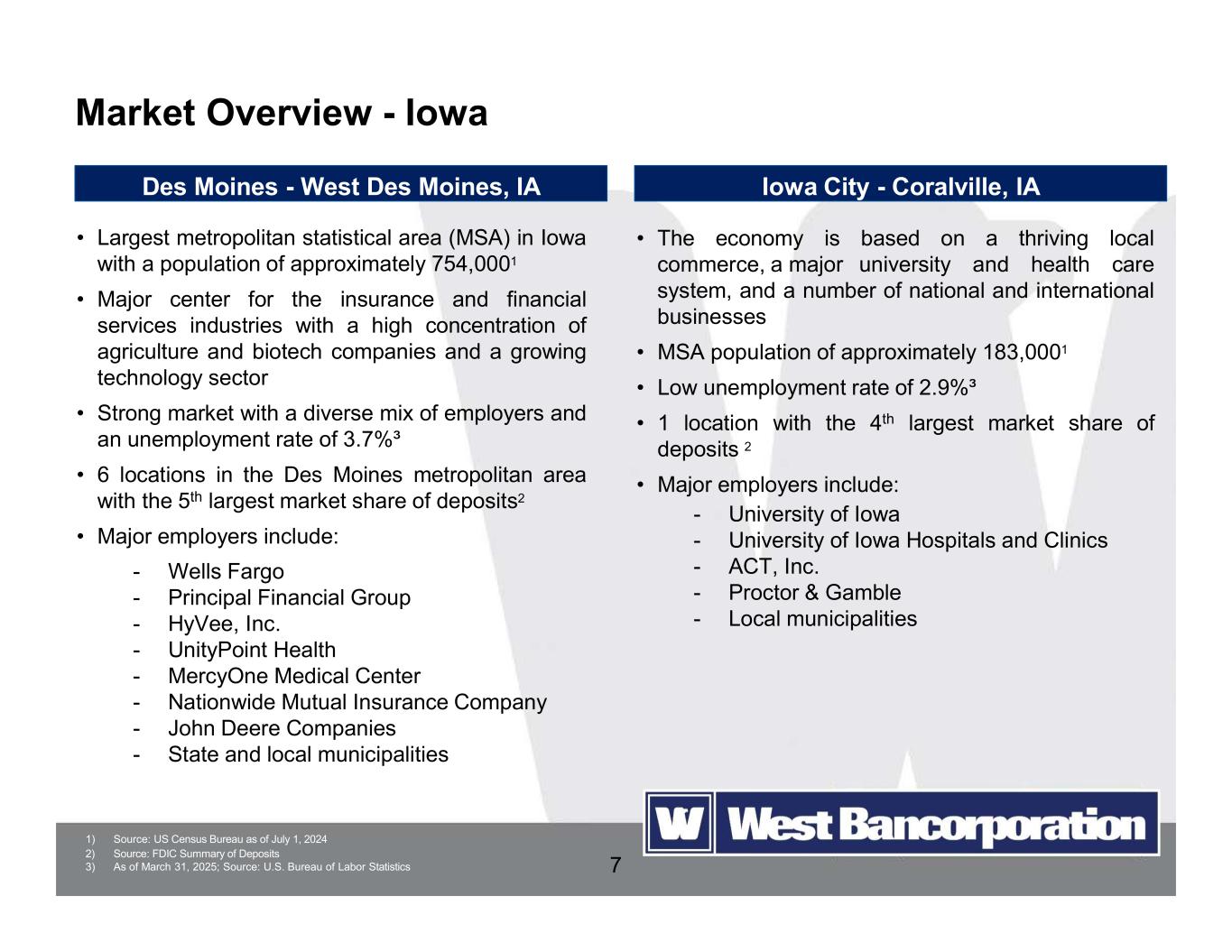 Meticulous Growth Strategy with Efficient Operations Investment Highlights 6  Conservative yet opportunistic growth strategy, driven by a combination of ongoing organic loan and core deposit growth from existing footprint.  Historic track record of successful lift-out strategies and employing a branch-lite structure in expansion markets to obtain quick branch level profitability.  Superior talent with business expertise in building relationships and providing a differentiated level of service.  Management possesses deep regional experience in Iowa and Minnesota, allowing them to partner with the right people. Historic success closely tied to that of our clients and the communities we serve.  Efficient and right-sized branch network, with a total of 11 locations serving 6 markets. Attractive Franchise with Impressive Historical Performance and Clean Credit Quality  Founded in 1893, West Bank is the oldest business of any kind in West Des Moines, IA.  Full service commercial bank with focus on small to medium sized businesses.  Long standing and highly respected franchise, with a track record as a reliable, dividend-paying community bank. Dividend yield over the last 10 years (2015-2024) has ranged from 2.71% to 4.72%.  A history as one of the highest performing and most efficient banks in the US, being recognized numerous times over the past decade for our financial performance by S&P Global, Raymond James, and Piper Sandler, among others.  Disciplined business model focused on risk management that has resulted in pristine credit quality.  Proven executive management team.