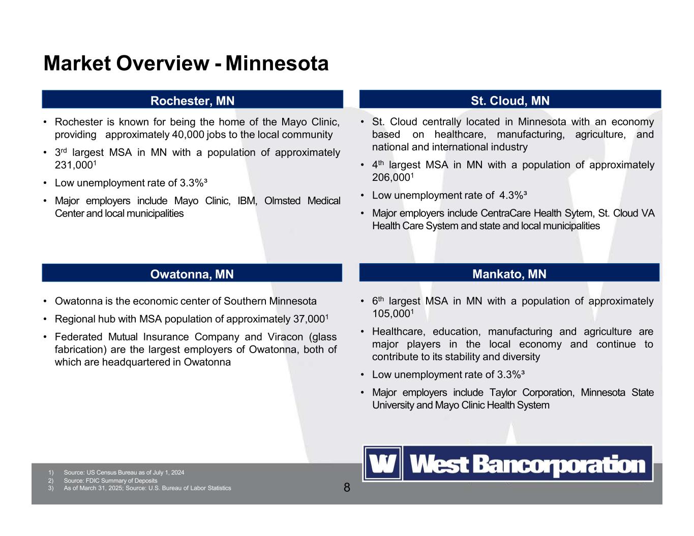 Market Overview - Iowa Des Moines - West Des Moines, IA • Largest metropolitan statistical area (MSA) in Iowa with a population of approximately 754,0001 • Major center for the insurance and financial services industries with a high concentration of agriculture and biotech companies and a growing technology sector • Strong market with a diverse mix of employers and an unemployment rate of 3.7%³ • 6 locations in the Des Moines metropolitan area with the 5th largest market share of deposits2 • Major employers include: Iowa City - Coralville, IA • The economy is based on a thriving local commerce, a major university and health care system, and a number of national and international businesses • MSA population of approximately 183,0001 • Low unemployment rate of 2.9%³ • 1 location with the 4th largest market share of deposits 2 • Major employers include: 1) Source: US Census Bureau as of July 1, 2024 2) Source: FDIC Summary of Deposits 3) As of March 31, 2025; Source: U.S. Bureau of Labor Statistics - Wells Fargo - Principal Financial Group - HyVee, Inc. - UnityPoint Health - MercyOne Medical Center - Nationwide Mutual Insurance Company - John Deere Companies - State and local municipalities - University of Iowa - University of Iowa Hospitals and Clinics - ACT, Inc. - Proctor & Gamble - Local municipalities 7