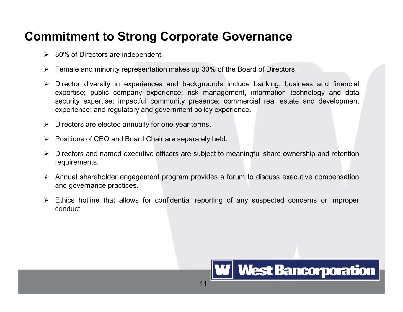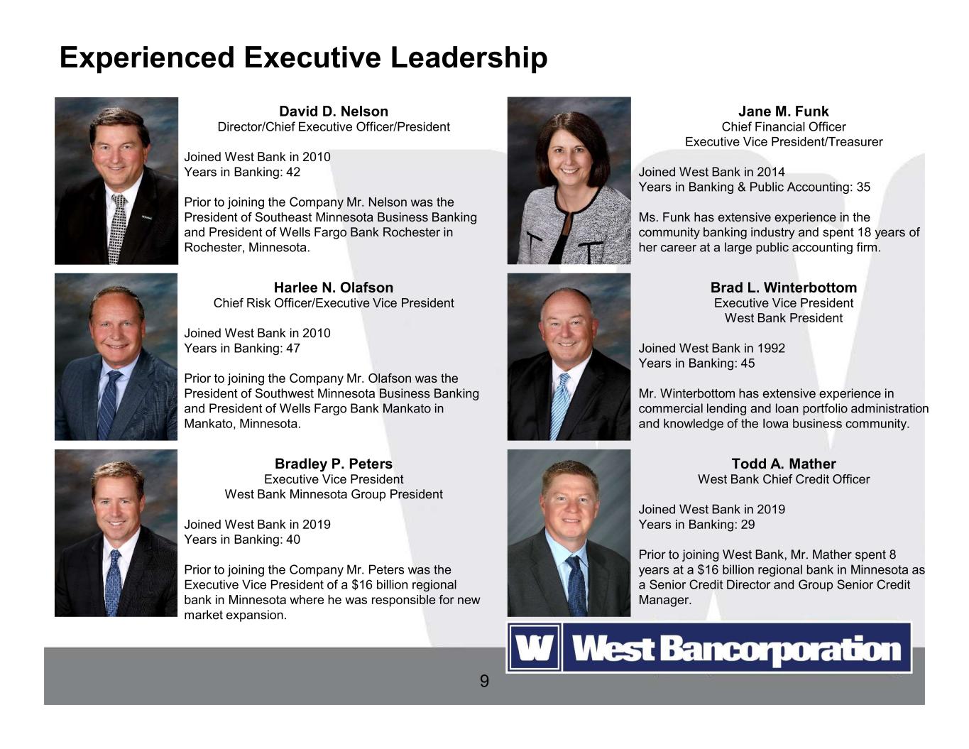 Experienced Executive Leadership David D. Nelson Director/Chief Executive Officer/President Joined West Bank in 2010 Years in Banking: 42 Prior to joining the Company Mr. Nelson was the President of Southeast Minnesota Business Banking and President of Wells Fargo Bank Rochester in Rochester, Minnesota. Harlee N. Olafson Chief Risk Officer/Executive Vice President Joined West Bank in 2010 Years in Banking: 47 Prior to joining the Company Mr. Olafson was the President of Southwest Minnesota Business Banking and President of Wells Fargo Bank Mankato in Mankato, Minnesota. Bradley P. Peters Executive Vice President West Bank Minnesota Group President Joined West Bank in 2019 Years in Banking: 40 Prior to joining the Company Mr. Peters was the Executive Vice President of a $16 billion regional bank in Minnesota where he was responsible for new market expansion. Jane M. Funk Chief Financial Officer Executive Vice President/Treasurer Joined West Bank in 2014 Years in Banking & Public Accounting: 35 Ms. Funk has extensive experience in the community banking industry and spent 18 years of her career at a large public accounting firm. Brad L. Winterbottom Executive Vice President West Bank President Joined West Bank in 1992 Years in Banking: 45 Mr. Winterbottom has extensive experience in commercial lending and loan portfolio administration and knowledge of the Iowa business community. Todd A. Mather West Bank Chief Credit Officer Joined West Bank in 2019 Years in Banking: 29 Prior to joining West Bank, Mr. Mather spent 8 years at a $16 billion regional bank in Minnesota as a Senior Credit Director and Group Senior Credit Manager. 9
