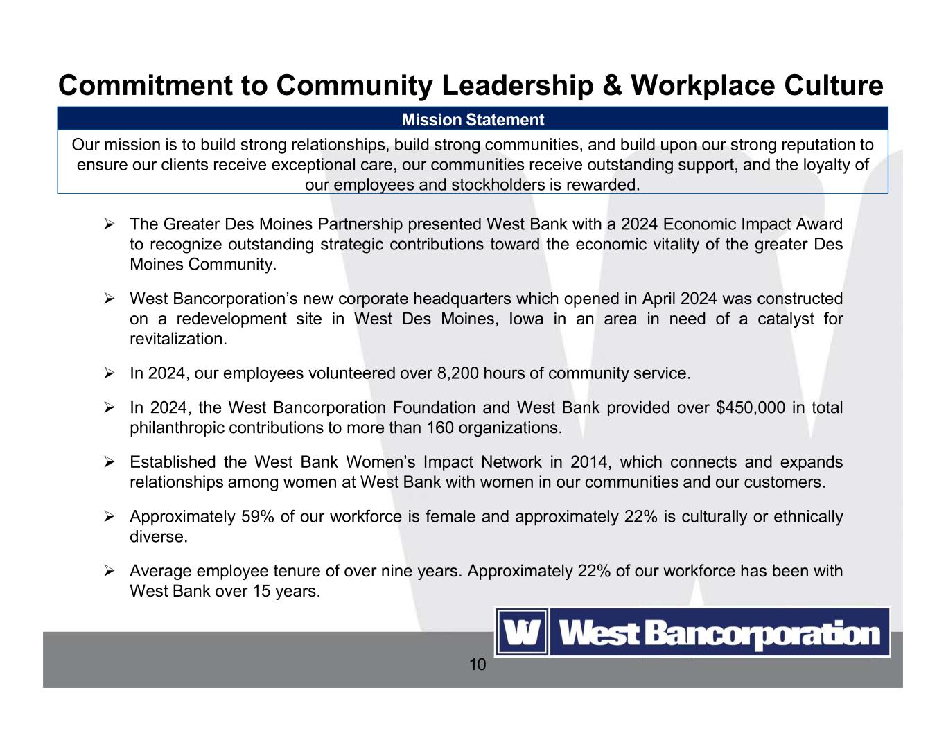 Commitment to Community Leadership & Workplace Culture 10  The Greater Des Moines Partnership presented West Bank with a 2024 Economic Impact Award to recognize outstanding strategic contributions toward the economic vitality of the greater Des Moines Community.  West Bancorporation’s new corporate headquarters which opened in April 2024 was constructed on a redevelopment site in West Des Moines, Iowa in an area in need of a catalyst for revitalization.  In 2024, our employees volunteered over 8,200 hours of community service.  In 2024, the West Bancorporation Foundation and West Bank provided over $450,000 in total philanthropic contributions to more than 160 organizations.  Established the West Bank Women’s Impact Network in 2014, which connects and expands relationships among women at West Bank with women in our communities and our customers.  Approximately 59% of our workforce is female and approximately 22% is culturally or ethnically diverse.  Average employee tenure of over nine years. Approximately 22% of our workforce has been with West Bank over 15 years. Mission Statement Our mission is to build strong relationships, build strong communities, and build upon our strong reputation to ensure our clients receive exceptional care, our communities receive outstanding support, and the loyalty of our employees and stockholders is rewarded.