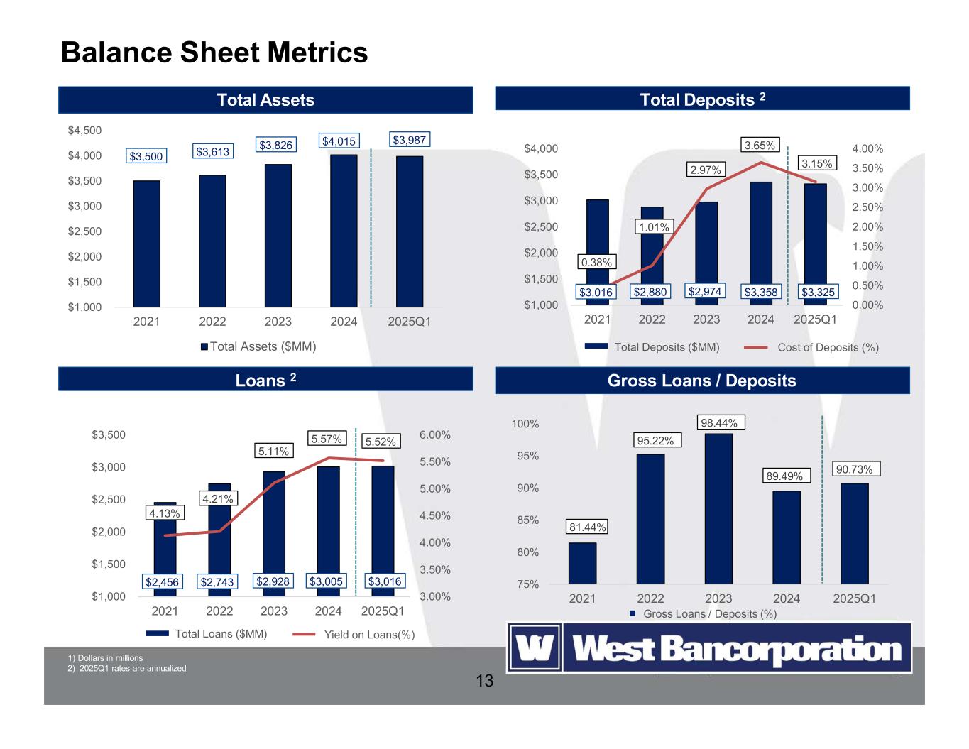 Business Line Overview 12 (1) As of March 31, 2025 Business and Commercial Banking • Commercial real estate lending • Construction and development financing • Commercial and industrial lending • Letters of credit • Full suite of deposit and treasury management services Personal Banking Product Offerings • Online and mobile delivery channels • Full suite of personal checking and savings options • Home equity lines of credit • Mortgage lending • Credit cards • Personal loans Investment Management and Trust Services • Estate administration • Conservatorships • Personal trusts • Charitable trusts • Agency accounts • Trust assets under management and custody of $611 million 1