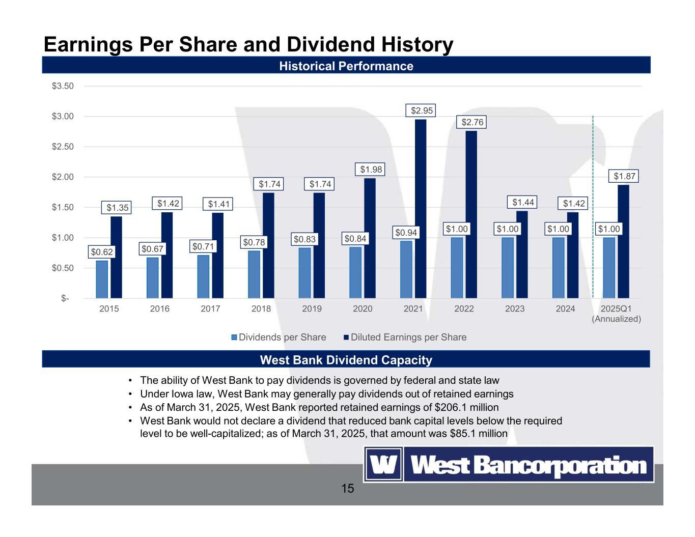 14 Return on Average Assets 1,2 Net Interest Margin 1,2,3 Return on Average Equity 1,2 Efficiency Ratio 1,3 Earnings and Profitability 1) WTBA peer medians; peer group as defined in Form 10-Q filed April 24, 2025: PEBO, NIC, GABC, FMBH, MOFG, MBWM, THFF, EQBK, FMNB, BWB, HBT, SMBC, HBIA, BFC, COFS, CIVB, FBIZ, FMAO, LCNB, ISBA; Financial data as of March 31, 2025 2) 2025Q1 data is annualized 3) Presented on an FTE basis; see Appendix for “Reconciliation of Non-GAAP Financial Measures” 1.52% 1.32% 0.66% 0.61% 0.81% 1.21% 1.21% 0.98% 1.07% 1.07% 0.00% 0.20% 0.40% 0.60% 0.80% 1.00% 1.20% 1.40% 1.60% 2021 2022 2023 2024 2025Q1 WTBA Peer 20.33% 20.71% 11.42% 10.71% 13.84% 11.68% 12.89% 11.20% 10.66% 10.30% 0.00% 5.00% 10.00% 15.00% 20.00% 25.00% 2021 2022 2023 2024 2025Q1 WTBA Peer 3.05% 2.76% 2.01% 1.91% 2.28% 3.32% 3.43% 3.32% 3.33% 3.51% 0.00% 0.50% 1.00% 1.50% 2.00% 2.50% 3.00% 3.50% 4.00% 2021 2022 2023 2024 2025Q1 WTBA Peer 40.91% 43.70% 60.73% 63.25% 56.37% 57.13% 56.64% 57.81% 59.65% 58.08% 0.00% 10.00% 20.00% 30.00% 40.00% 50.00% 60.00% 70.00% 2021 2022 2023 2024 2025Q1 WTBA Peer