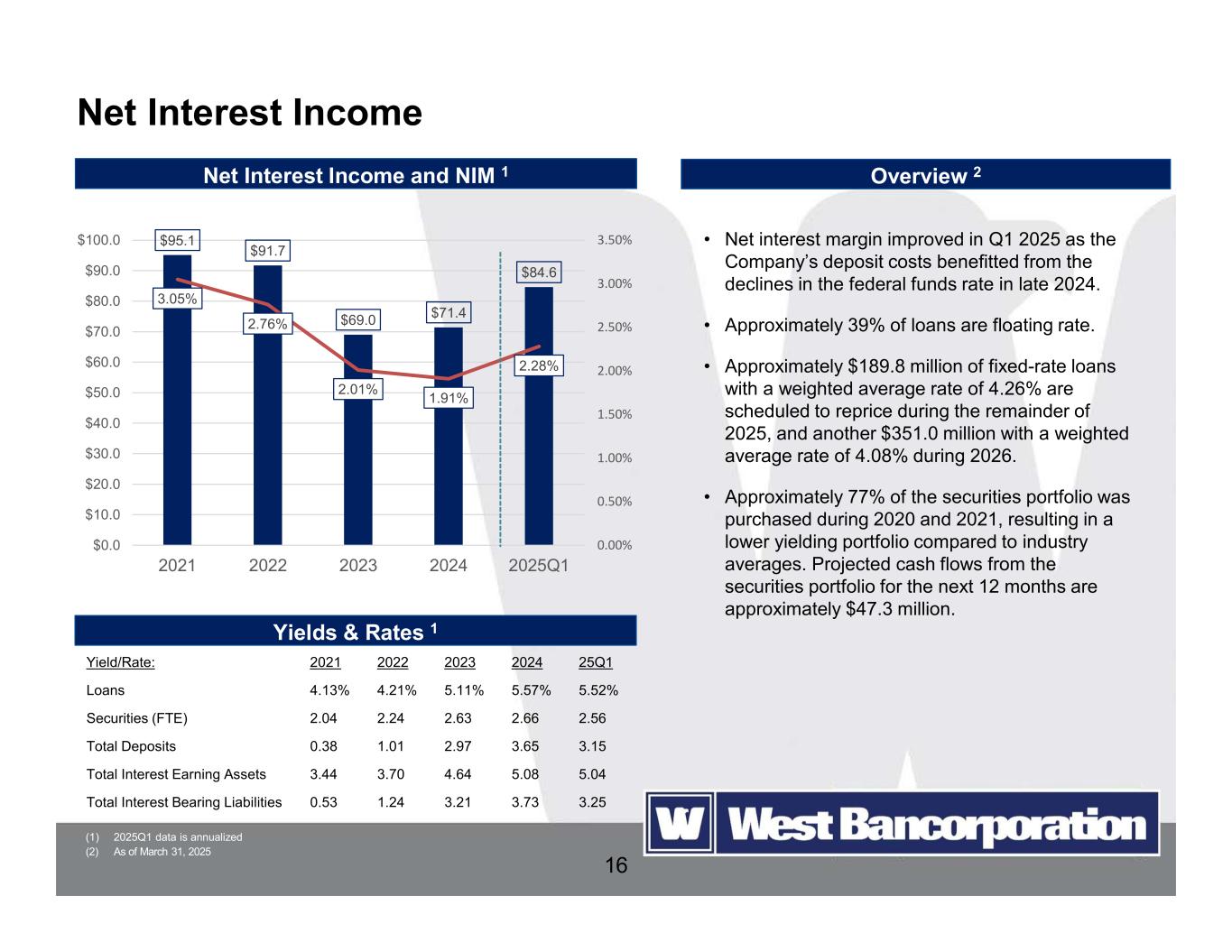 15 Earnings Per Share and Dividend History $0.62 $0.67 $0.71 $0.78 $0.83 $0.84 $0.94 $1.00 $1.00 $1.00 $1.00 $1.35 $1.42 $1.41 $1.74 $1.74 $1.98 $2.95 $2.76 $1.44 $1.42 $1.87 $- $0.50 $1.00 $1.50 $2.00 $2.50 $3.00 $3.50 2015 2016 2017 2018 2019 2020 2021 2022 2023 2024 2025Q1 (Annualized) Dividends per Share Diluted Earnings per Share • The ability of West Bank to pay dividends is governed by federal and state law • Under Iowa law, West Bank may generally pay dividends out of retained earnings • As of March 31, 2025, West Bank reported retained earnings of $206.1 million • West Bank would not declare a dividend that reduced bank capital levels below the required level to be well-capitalized; as of March 31, 2025, that amount was $85.1 million Historical Performance West Bank Dividend Capacity