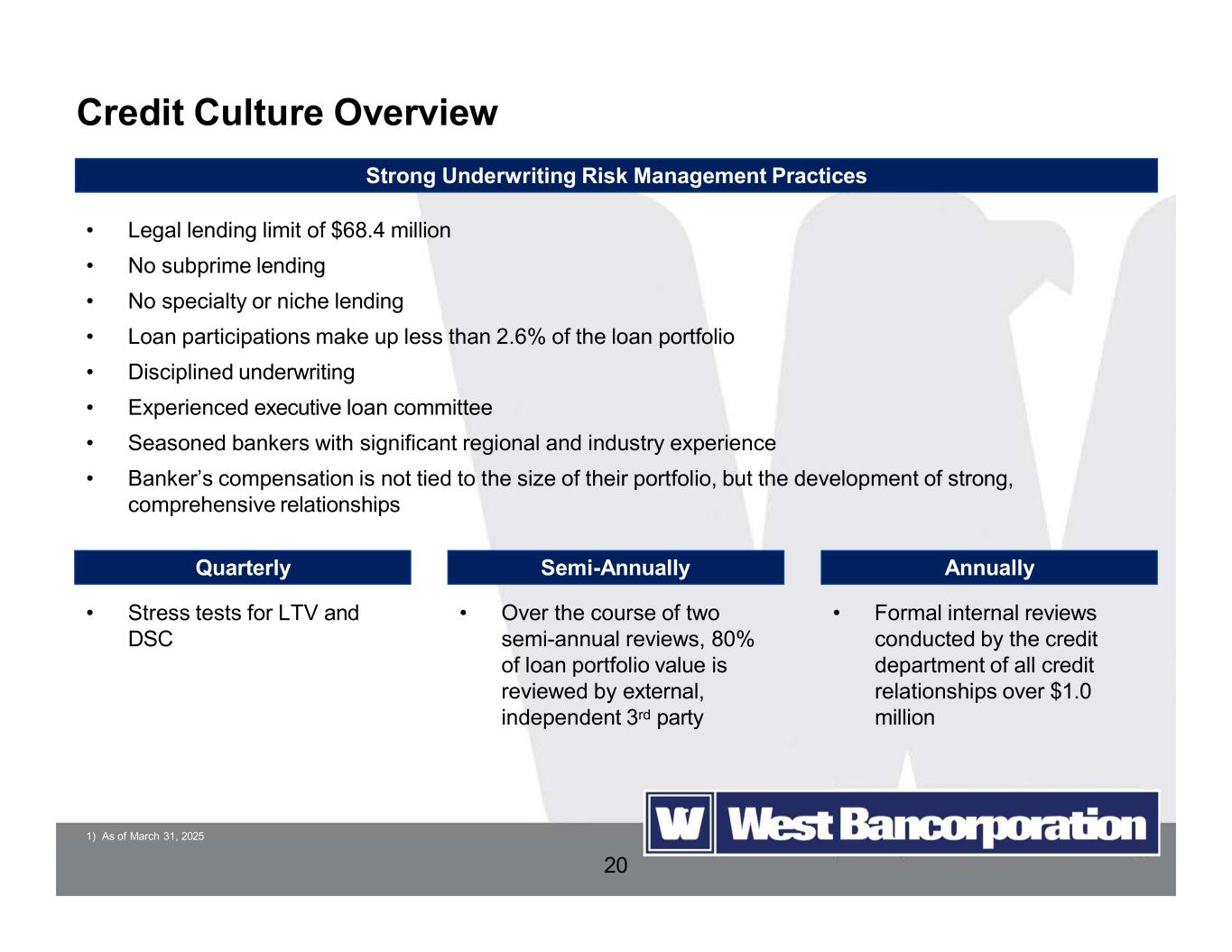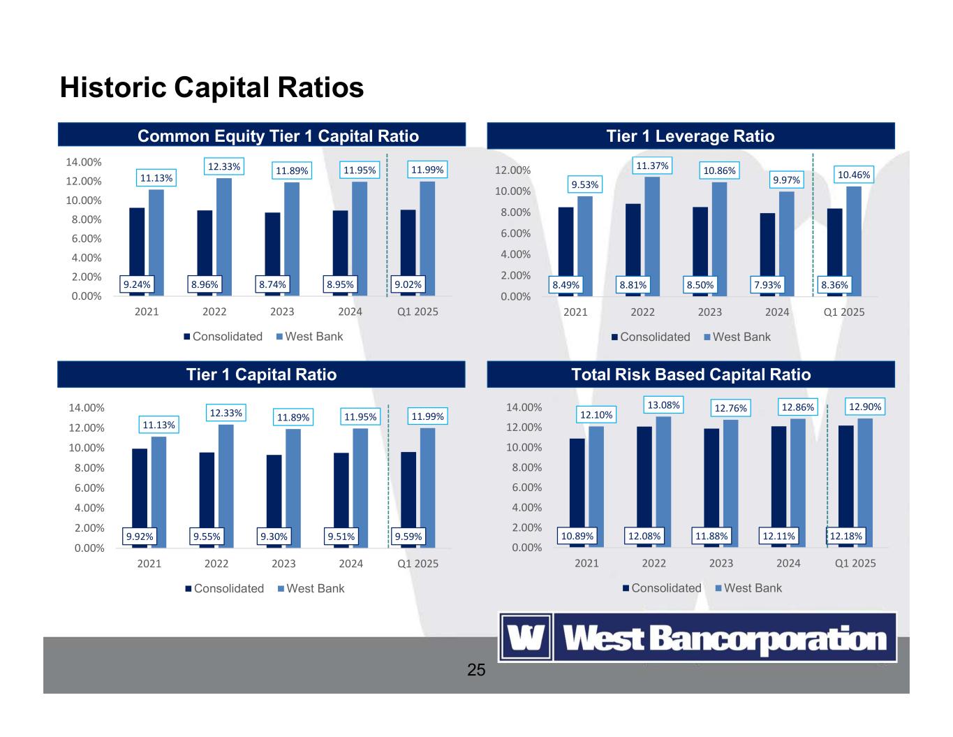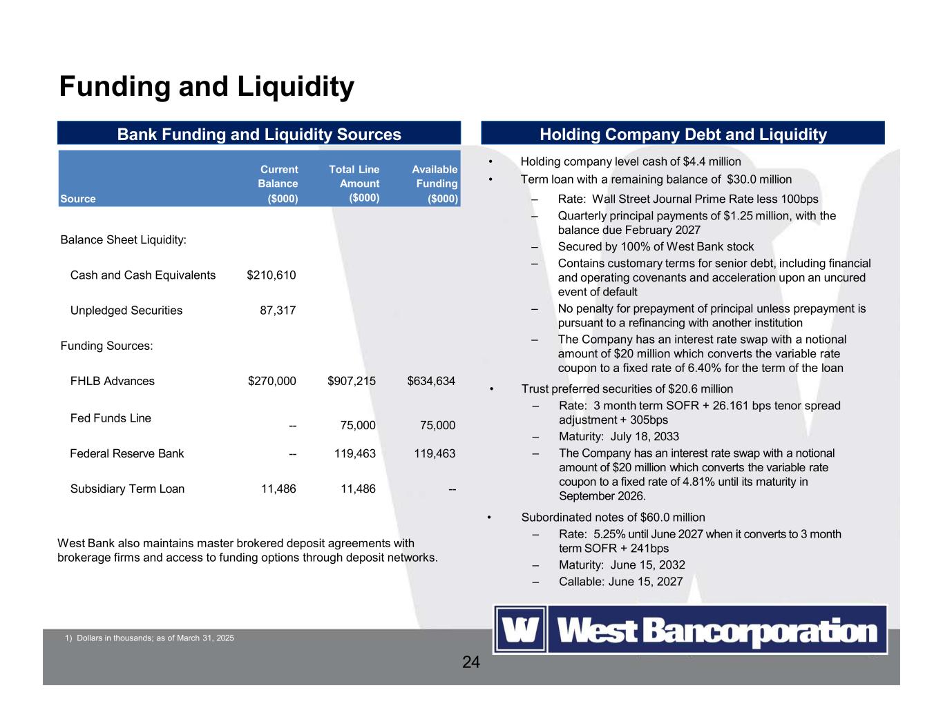 24 Funding and Liquidity 1) Dollars in thousands; as of March 31, 2025 • Holding company level cash of $4.4 million • Term loan with a remaining balance of $30.0 million – Rate: Wall Street Journal Prime Rate less 100bps – Quarterly principal payments of $1.25 million, with the balance due February 2027 – Secured by 100% of West Bank stock – Contains customary terms for senior debt, including financial and operating covenants and acceleration upon an uncured event of default – No penalty for prepayment of principal unless prepayment is pursuant to a refinancing with another institution – The Company has an interest rate swap with a notional amount of $20 million which converts the variable rate coupon to a fixed rate of 6.40% for the term of the loan • Trust preferred securities of $20.6 million – Rate: 3 month term SOFR + 26.161 bps tenor spread adjustment + 305bps – Maturity: July 18, 2033 – The Company has an interest rate swap with a notional amount of $20 million which converts the variable rate coupon to a fixed rate of 4.81% until its maturity in September 2026. Bank Funding and Liquidity Sources Holding Company Debt and Liquidity Source Current Balance ($000) Total Line Amount ($000) Available Funding ($000) Balance Sheet Liquidity: $210,610Cash and Cash Equivalents 87,317Unpledged Securities Funding Sources: $634,634$907,215$270,000FHLB Advances 75,00075,000-- Fed Funds Line 119,463119,463--Federal Reserve Bank --11,48611,486Subsidiary Term Loan • Subordinated notes of $60.0 million – Rate: 5.25% until June 2027 when it converts to 3 month term SOFR + 241bps – Maturity: June 15, 2032 – Callable: June 15, 2027 West Bank also maintains master brokered deposit agreements with brokerage firms and access to funding options through deposit networks.