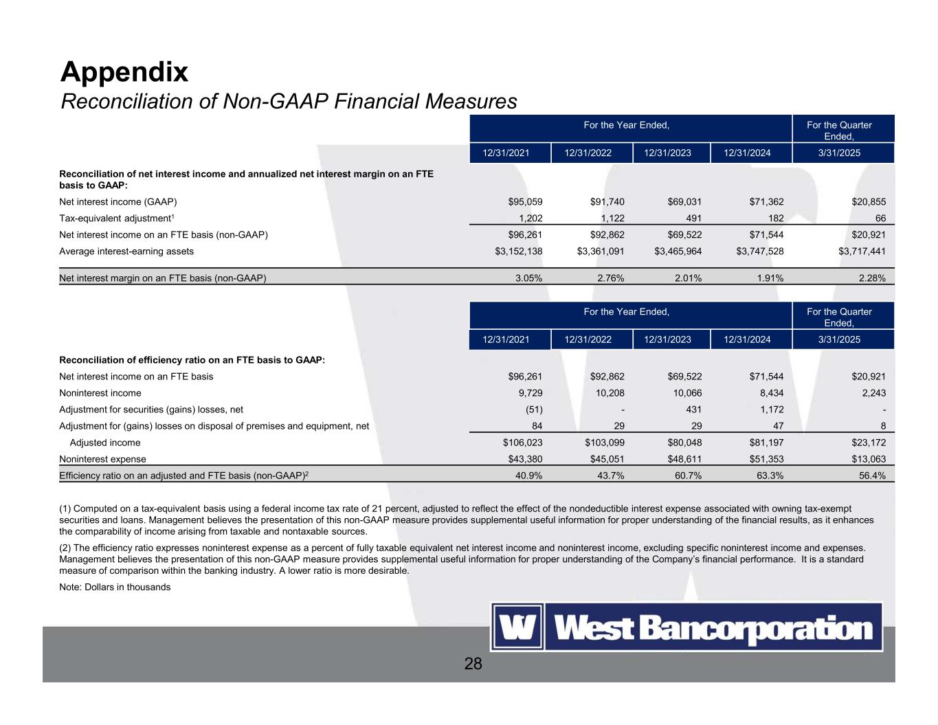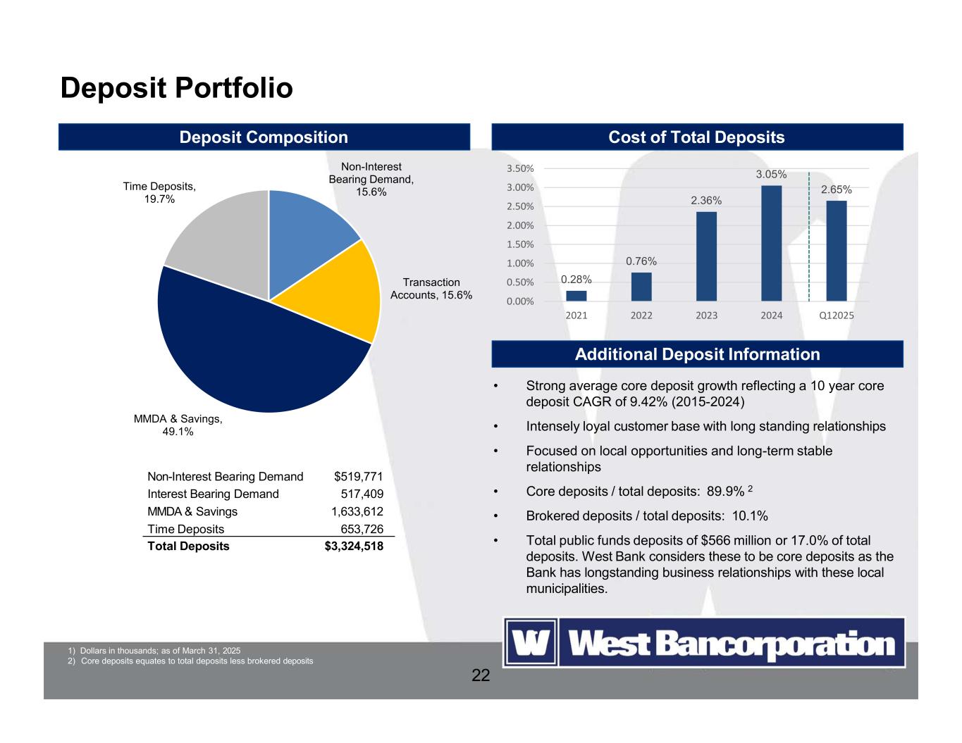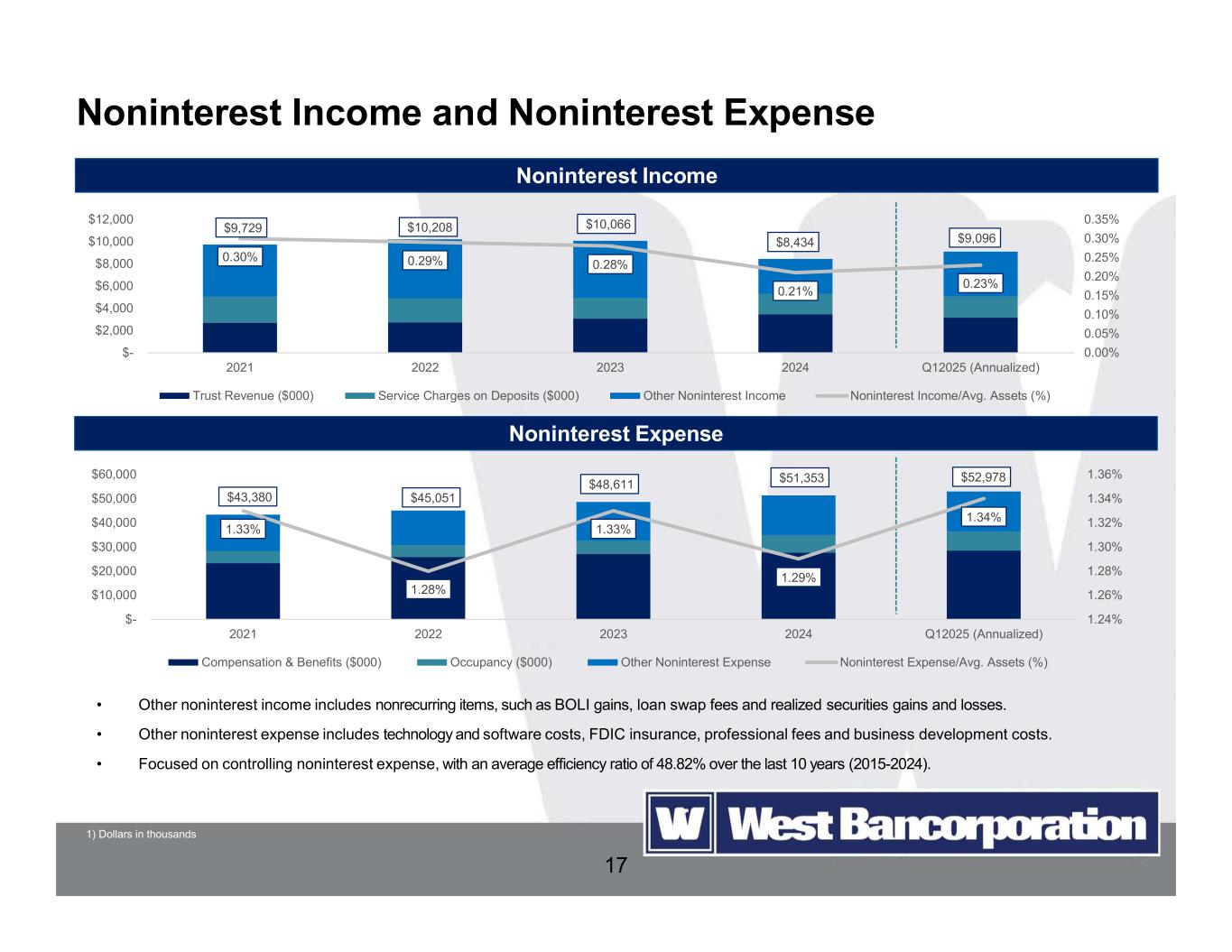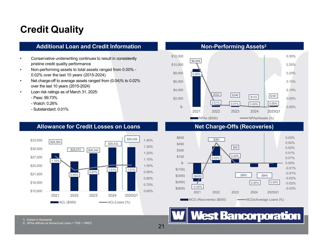 24 Funding and Liquidity 1) Dollars in thousands; as of March 31, 2025 • Holding company level cash of $4.4 million • Term loan with a remaining balance of $30.0 million – Rate: Wall Street Journal Prime Rate less 100bps – Quarterly principal payments of $1.25 million, with the balance due February 2027 – Secured by 100% of West Bank stock – Contains customary terms for senior debt, including financial and operating covenants and acceleration upon an uncured event of default – No penalty for prepayment of principal unless prepayment is pursuant to a refinancing with another institution – The Company has an interest rate swap with a notional amount of $20 million which converts the variable rate coupon to a fixed rate of 6.40% for the term of the loan • Trust preferred securities of $20.6 million – Rate: 3 month term SOFR + 26.161 bps tenor spread adjustment + 305bps – Maturity: July 18, 2033 – The Company has an interest rate swap with a notional amount of $20 million which converts the variable rate coupon to a fixed rate of 4.81% until its maturity in September 2026. Bank Funding and Liquidity Sources Holding Company Debt and Liquidity Source Current Balance ($000) Total Line Amount ($000) Available Funding ($000) Balance Sheet Liquidity: $210,610Cash and Cash Equivalents 87,317Unpledged Securities Funding Sources: $634,634$907,215$270,000FHLB Advances 75,00075,000-- Fed Funds Line 119,463119,463--Federal Reserve Bank --11,48611,486Subsidiary Term Loan • Subordinated notes of $60.0 million – Rate: 5.25% until June 2027 when it converts to 3 month term SOFR + 241bps – Maturity: June 15, 2032 – Callable: June 15, 2027 West Bank also maintains master brokered deposit agreements with brokerage firms and access to funding options through deposit networks.