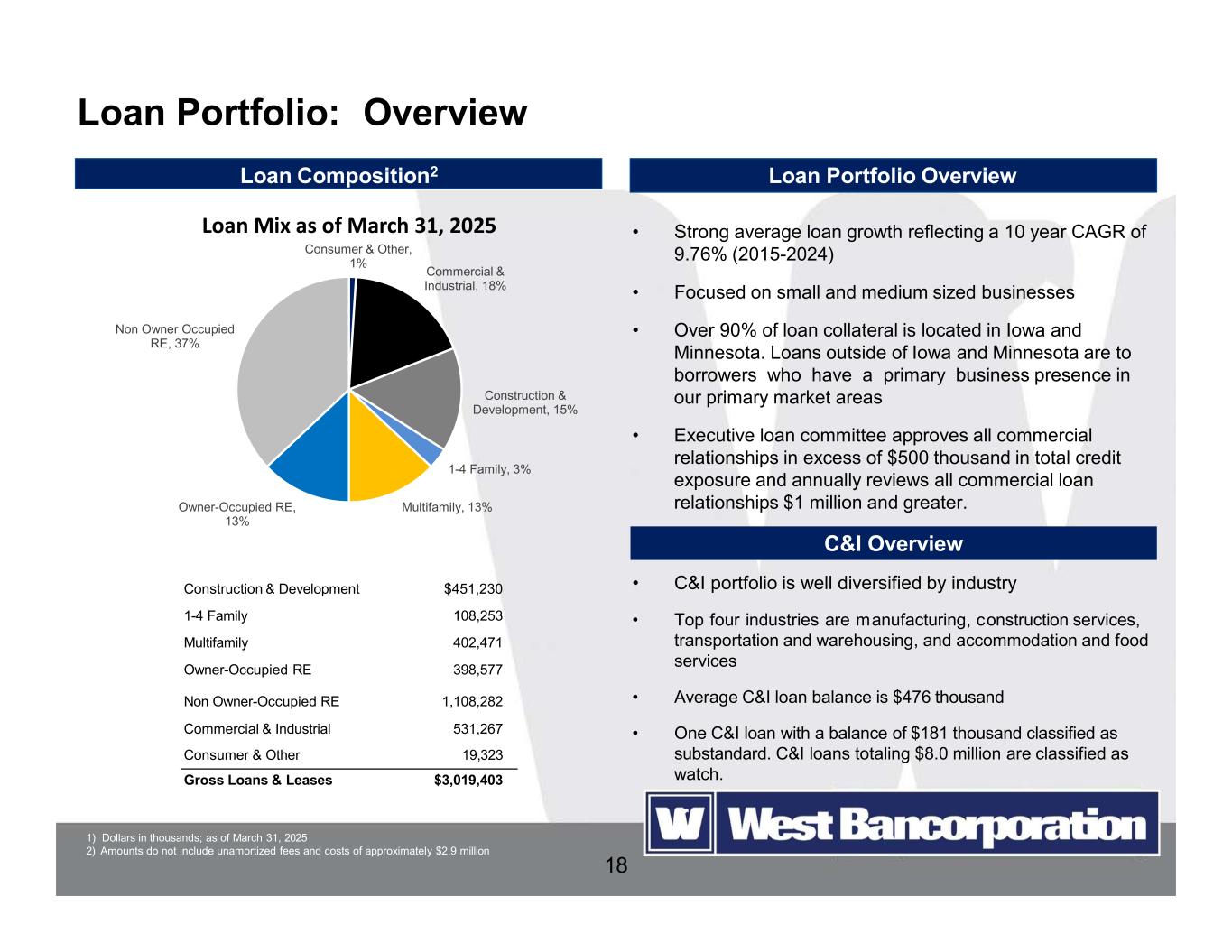 Noninterest Income Noninterest Expense Noninterest Income and Noninterest Expense 1) Dollars in thousands 17 • Other noninterest income includes nonrecurring items, such as BOLI gains, loan swap fees and realized securities gains and losses. • Other noninterest expense includes technology and software costs, FDIC insurance, professional fees and business development costs. • Focused on controlling noninterest expense, with an average efficiency ratio of 48.82% over the last 10 years (2015-2024). $9,729 $10,208 $10,066 $8,434 $9,096 0.30% 0.29% 0.28% 0.21% 0.23% 0.00% 0.05% 0.10% 0.15% 0.20% 0.25% 0.30% 0.35% $- $2,000 $4,000 $6,000 $8,000 $10,000 $12,000 2021 2022 2023 2024 Q12025 (Annualized) Trust Revenue ($000) Service Charges on Deposits ($000) Other Noninterest Income Noninterest Income/Avg. Assets (%) $43,380 $45,051 $48,611 $51,353 $52,978 1.33% 1.28% 1.33% 1.29% 1.34% 1.24% 1.26% 1.28% 1.30% 1.32% 1.34% 1.36% $- $10,000 $20,000 $30,000 $40,000 $50,000 $60,000 2021 2022 2023 2024 Q12025 (Annualized) Compensation & Benefits ($000) Occupancy ($000) Other Noninterest Expense Noninterest Expense/Avg. Assets (%)