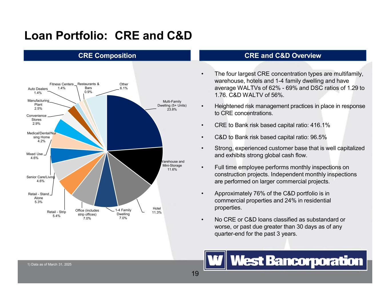 Loan Portfolio: Overview 18 1) Dollars in thousands; as of March 31, 2025 2) Amounts do not include unamortized fees and costs of approximately $2.9 million Loan Composition2 Loan Portfolio Overview $451,230Construction & Development 108,2531-4 Family 402,471Multifamily 398,577Owner-Occupied RE 1,108,282Non Owner-Occupied RE 531,267Commercial & Industrial 19,323Consumer & Other $3,019,403Gross Loans & Leases • Strong average loan growth reflecting a 10 year CAGR of 9.76% (2015-2024) • Focused on small and medium sized businesses • Over 90% of loan collateral is located in Iowa and Minnesota. Loans outside of Iowa and Minnesota are to borrowers who have a primary business presence in our primary market areas • Executive loan committee approves all commercial relationships in excess of $500 thousand in total credit exposure and annually reviews all commercial loan relationships $1 million and greater. Consumer & Other, 1% Commercial & Industrial, 18% Construction & Development, 15% 1-4 Family, 3% Multifamily, 13%Owner-Occupied RE, 13% Non Owner Occupied RE, 37% Loan Mix as of March 31, 2025 • C&I portfolio is well diversified by industry • Top four industries are manufacturing, construction services, transportation and warehousing, and accommodation and food services • Average C&I loan balance is $476 thousand • One C&I loan with a balance of $181 thousand classified as substandard. C&I loans totaling $8.0 million are classified as watch. C&I Overview