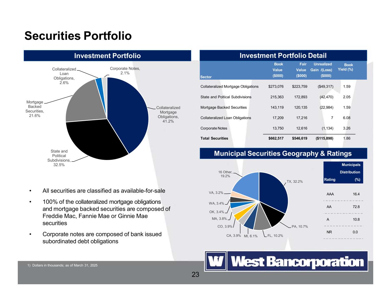 Deposit Portfolio 22 Deposit Composition Cost of Total Deposits Additional Deposit Information 1) Dollars in thousands; as of March 31, 2025 2) Core deposits equates to total deposits less brokered deposits $519,771Non-Interest Bearing Demand 517,409Interest Bearing Demand 1,633,612MMDA & Savings 653,726Time Deposits $3,324,518Total Deposits • Strong average core deposit growth reflecting a 10 year core deposit CAGR of 9.42% (2015-2024) • Intensely loyal customer base with long standing relationships • Focused on local opportunities and long-term stable relationships • Core deposits / total deposits: 89.9% 2 • Brokered deposits / total deposits: 10.1% • Total public funds deposits of $566 million or 17.0% of total deposits. West Bank considers these to be core deposits as the Bank has longstanding business relationships with these local municipalities. Non-Interest Bearing Demand, 15.6% Transaction Accounts, 15.6% MMDA & Savings, 49.1% Time Deposits, 19.7% 0.28% 0.76% 2.36% 3.05% 2.65% 0.00% 0.50% 1.00% 1.50% 2.00% 2.50% 3.00% 3.50% 2021 2022 2023 2024 Q12025