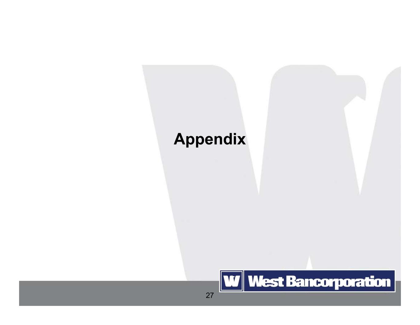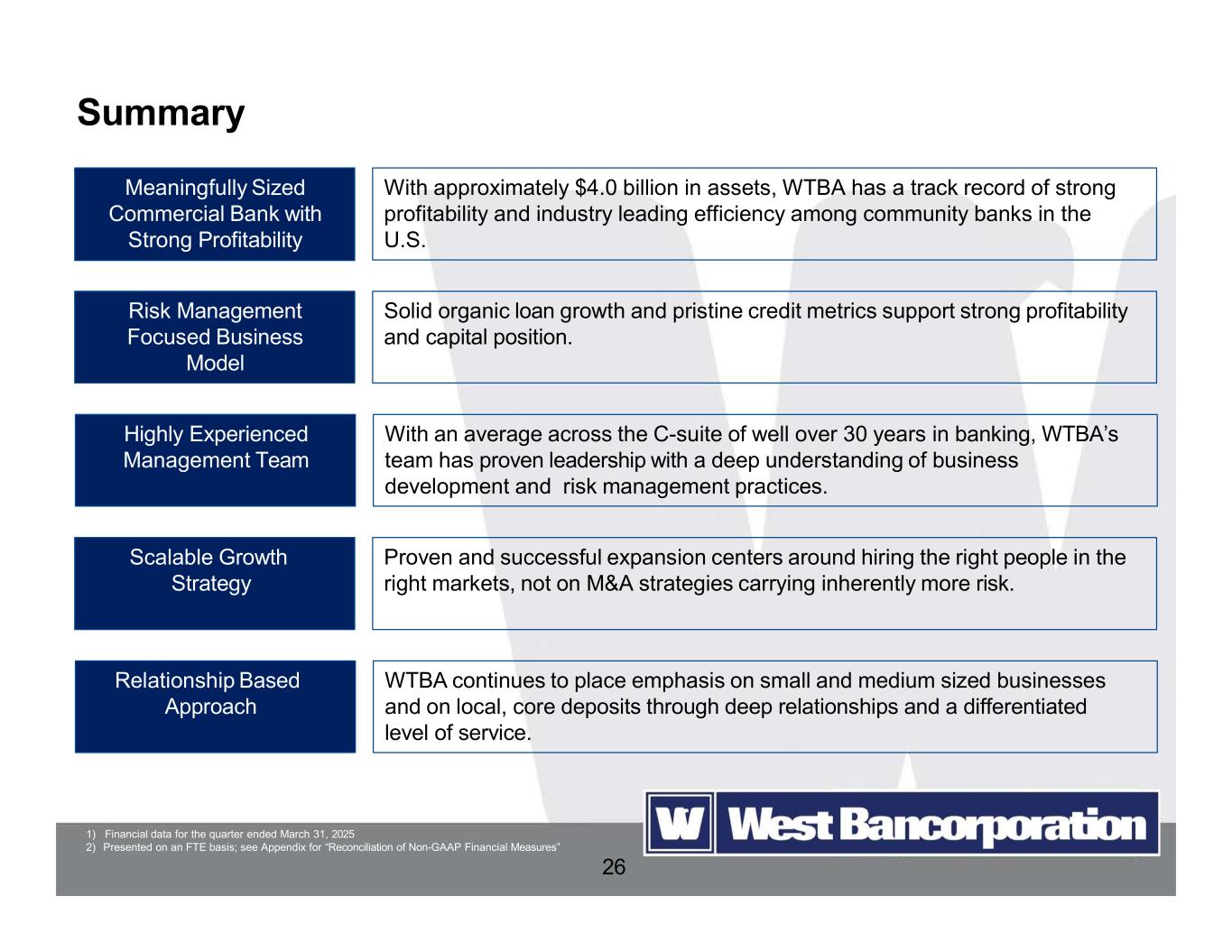 Historic Capital Ratios 25 Common Equity Tier 1 Capital Ratio Tier 1 Capital Ratio Tier 1 Leverage Ratio Total Risk Based Capital Ratio 9.24% 8.96% 8.74% 8.95% 9.02% 11.13% 12.33% 11.89% 11.95% 11.99% 0.00% 2.00% 4.00% 6.00% 8.00% 10.00% 12.00% 14.00% 2021 2022 2023 2024 Q1 2025 Consolidated West Bank 8.49% 8.81% 8.50% 7.93% 8.36% 9.53% 11.37% 10.86% 9.97% 10.46% 0.00% 2.00% 4.00% 6.00% 8.00% 10.00% 12.00% 2021 2022 2023 2024 Q1 2025 Consolidated West Bank 9.92% 9.55% 9.30% 9.51% 9.59% 11.13% 12.33% 11.89% 11.95% 11.99% 0.00% 2.00% 4.00% 6.00% 8.00% 10.00% 12.00% 14.00% 2021 2022 2023 2024 Q1 2025 Consolidated West Bank 10.89% 12.08% 11.88% 12.11% 12.18% 12.10% 13.08% 12.76% 12.86% 12.90% 0.00% 2.00% 4.00% 6.00% 8.00% 10.00% 12.00% 14.00% 2021 2022 2023 2024 Q1 2025 Consolidated West Bank