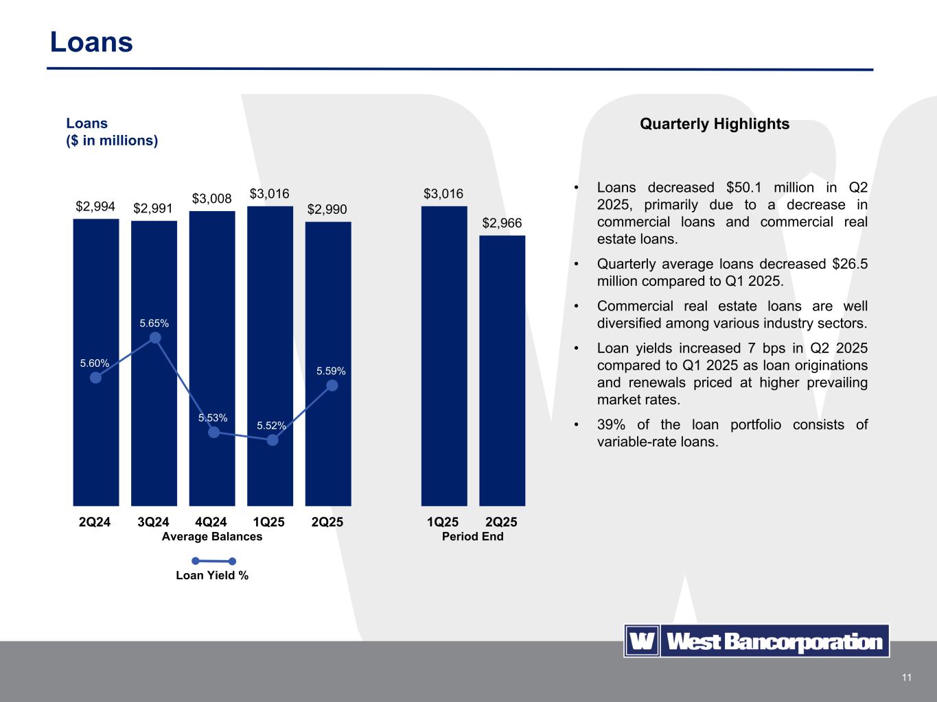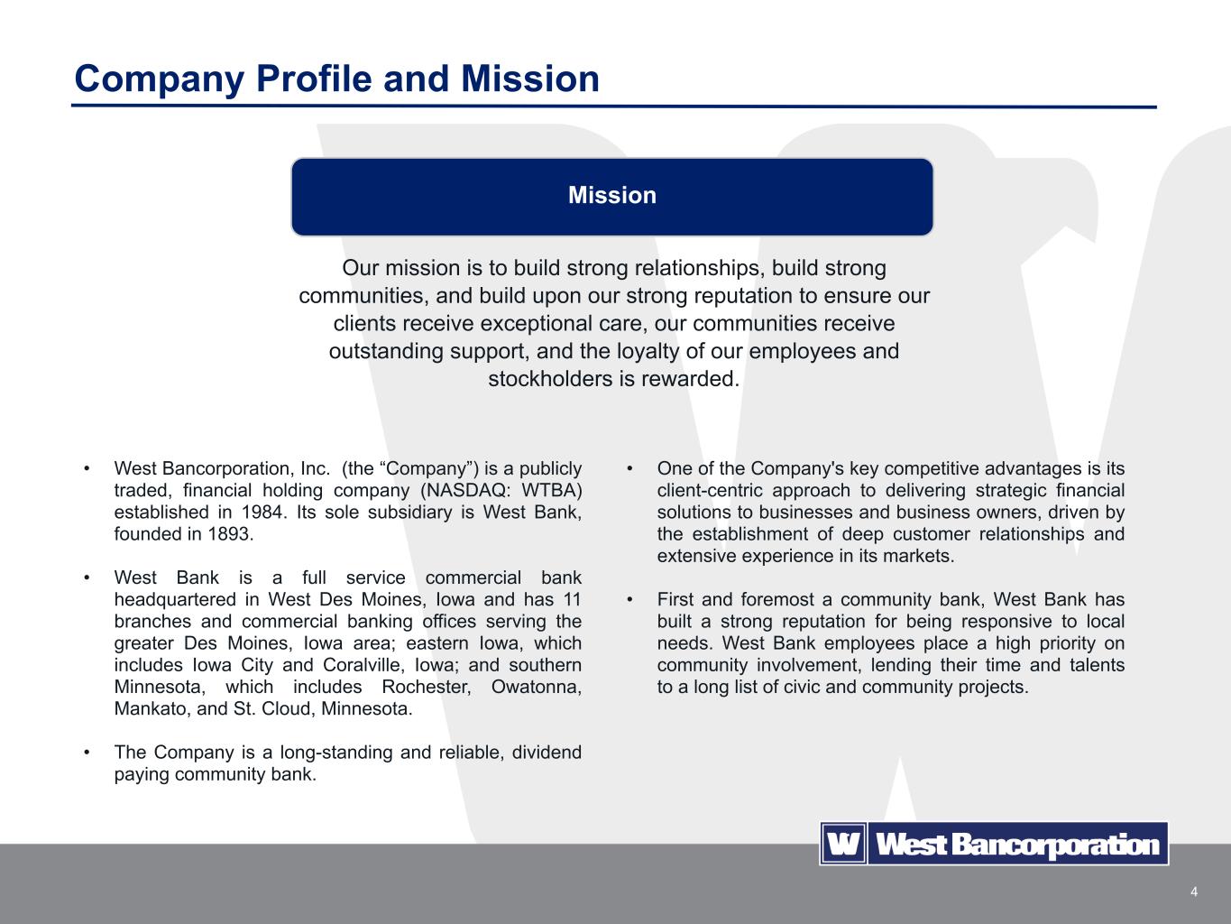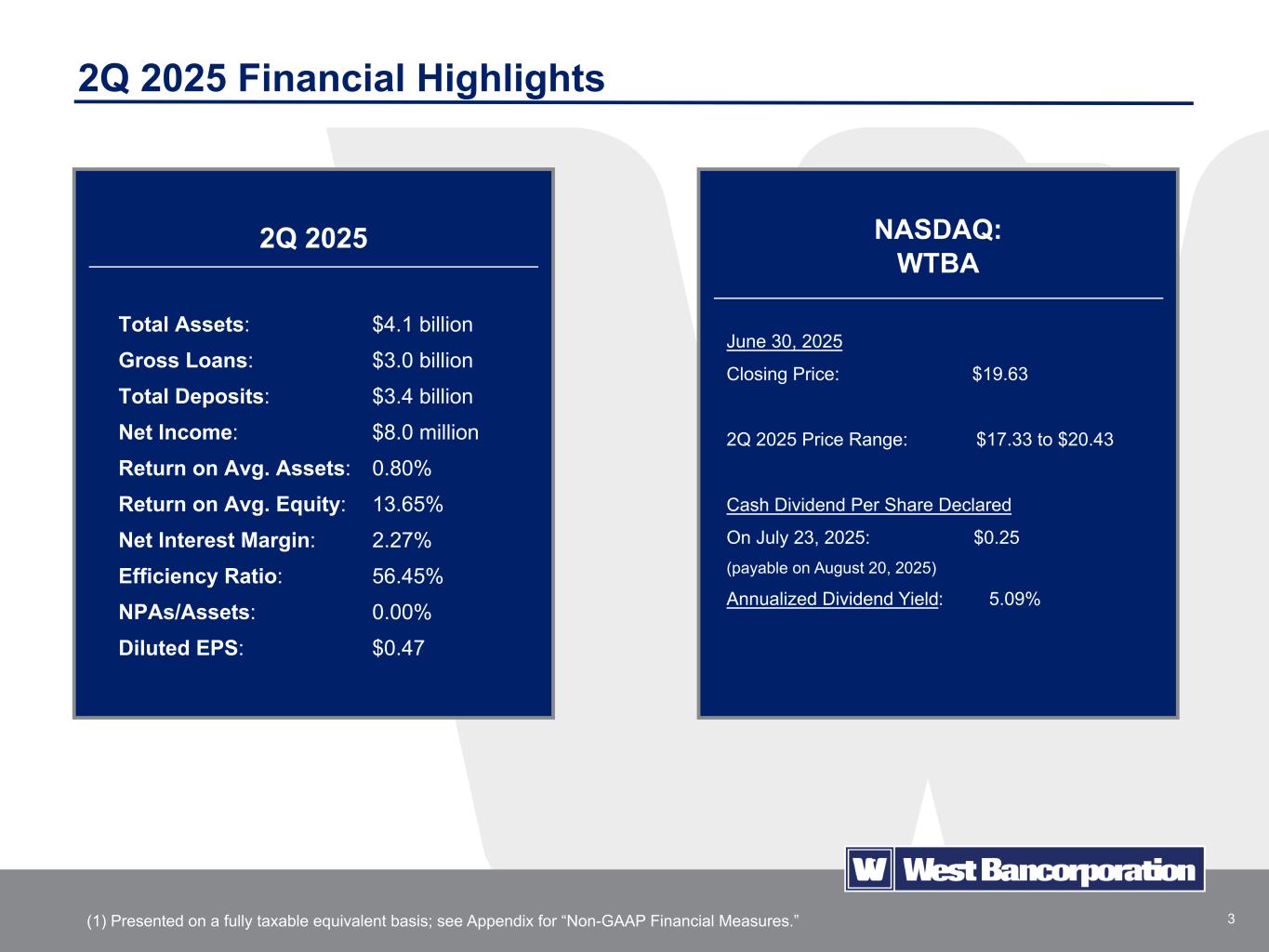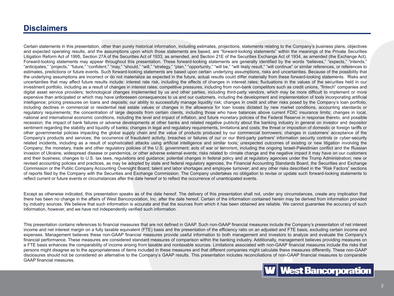 2 Certain statements in this presentation, other than purely historical information, including estimates, projections, statements relating to the Company’s business plans, objectives and expected operating results, and the assumptions upon which those statements are based, are “forward-looking statements” within the meanings of the Private Securities Litigation Reform Act of 1995, Section 27A of the Securities Act of 1933, as amended, and Section 21E of the Securities Exchange Act of 1934, as amended (the Exchange Act). Forward-looking statements may appear throughout this presentation. These forward-looking statements are generally identified by the words “believes,” “expects,” “intends,” “anticipates,” “projects,” “future,” “confident,” “may,” “should,” “will,” “strategy,” “plan,” “opportunity,” “will be,” “will likely result,” “will continue” or similar references, or references to estimates, predictions or future events. Such forward-looking statements are based upon certain underlying assumptions, risks and uncertainties. Because of the possibility that the underlying assumptions are incorrect or do not materialize as expected in the future, actual results could differ materially from these forward-looking statements. Risks and uncertainties that may affect future results include: interest rate risk, including the effects of changes in interest rates; fluctuations in the values of the securities held in our investment portfolio, including as a result of changes in interest rates; competitive pressures, including from non-bank competitors such as credit unions, “fintech” companies and digital asset service providers; technological changes implemented by us and other parties, including third-party vendors, which may be more difficult to implement or more expensive than anticipated or which may have unforeseen consequences to us and our customers, including the development and implementation of tools incorporating artificial intelligence; pricing pressures on loans and deposits; our ability to successfully manage liquidity risk; changes in credit and other risks posed by the Company’s loan portfolio, including declines in commercial or residential real estate values or changes in the allowance for loan losses dictated by new market conditions, accounting standards or regulatory requirements; the concentration of large deposits from certain clients, including those who have balances above current FDIC insurance limits; changes in local, national and international economic conditions, including the level and impact of inflation, and future monetary policies of the Federal Reserve in response thereto, and possible recession; the impact of bank failures or adverse developments at other banks and related negative publicity about the banking industry in general on investor and depositor sentiment regarding the stability and liquidity of banks; changes in legal and regulatory requirements, limitations and costs; the threat or imposition of domestic or foreign tariffs or other governmental policies impacting the global supply chain and the value of products produced by our commercial borrowers; changes in customers’ acceptance of the Company’s products and services; the occurrence of fraudulent activity, breaches or failures of our or our third-party partners' information security controls or cyber-security related incidents, including as a result of sophisticated attacks using artificial intelligence and similar tools; unexpected outcomes of existing or new litigation involving the Company; the monetary, trade and other regulatory policies of the U.S. government; acts of war or terrorism, including the ongoing Israeli-Palestinian conflict and the Russian invasion of Ukraine, widespread disease or pandemics, or other adverse external events; risks related to climate change and the negative impact it may have on our customers and their business; changes to U.S. tax laws, regulations and guidance; potential changes in federal policy and at regulatory agencies under the Trump Administration; new or revised accounting policies and practices, as may be adopted by state and federal regulatory agencies, the Financial Accounting Standards Board, the Securities and Exchange Commission or the Public Company Accounting Oversight Board; talent and labor shortages and employee turnover; and any other risks described in the “Risk Factors” sections of reports filed by the Company with the Securities and Exchange Commission. The Company undertakes no obligation to revise or update such forward-looking statements to reflect current or future events or circumstances after the date hereof or to reflect the occurrence of unanticipated events. Except as otherwise indicated, this presentation speaks as of the date hereof. The delivery of this presentation shall not, under any circumstances, create any implication that there has been no change in the affairs of West Bancorporation, Inc. after the date hereof. Certain of the information contained herein may be derived from information provided by industry sources. We believe that such information is accurate and that the sources from which it has been obtained are reliable. We cannot guarantee the accuracy of such information, however, and we have not independently verified such information. This presentation contains references to financial measures that are not defined in GAAP. Such non-GAAP financial measures include the Company’s presentation of net interest income and net interest margin on a fully taxable equivalent (FTE) basis and the presentation of the efficiency ratio on an adjusted and FTE basis, excluding certain income and expenses. Management believes these non-GAAP financial measures provide useful information to both management and investors to analyze and evaluate the Company’s financial performance. These measures are considered standard measures of comparison wi