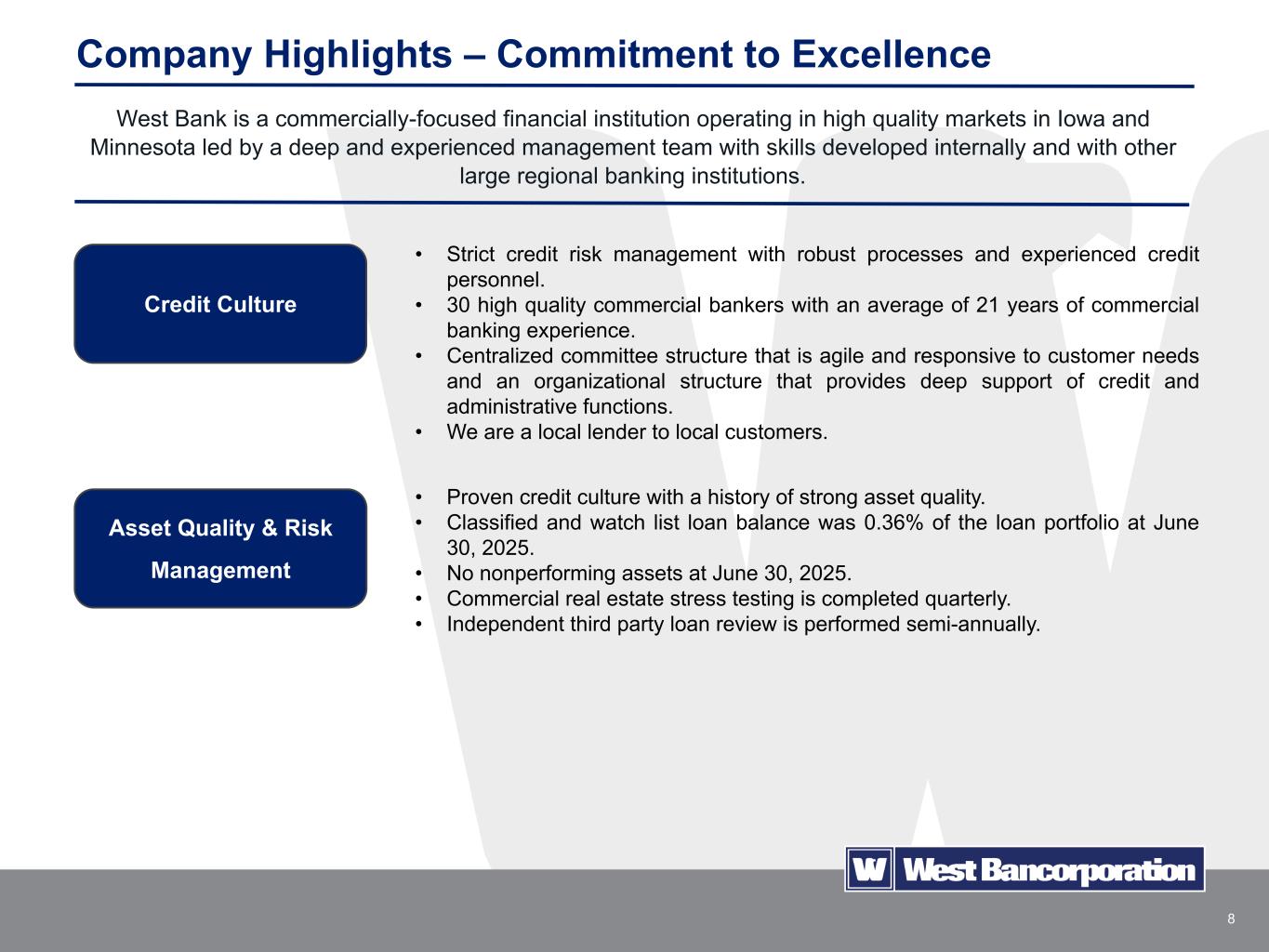 7 Company Highlights – Commitment to Excellence West Bancorporation, Inc. is a high performing company in U.S. community banking, well-versed in providing commercial banking services, including loans and lines of credit and all types of deposit services, to small- and medium-sized businesses in its Iowa and Minnesota markets. Attractive Franchise • A 132 year presence in the Des Moines, Iowa metropolitan area and is West Des Moines' oldest business of any type. • Long track record of growth and stability coupled with attractive financial returns and dividend yield. • Simple and consistent business model with a conservative operating philosophy and expense management controls. Strategy • Organic growth strategy with a track record of successful lift-out strategies and employing a branch-lite structure. • Disciplined business model highlighted by focus on risk management and consistent execution that has resulted in pristine credit quality. • Superior talent with business expertise in building relationships and providing a differentiated level of service. Community Service & Philanthropy • In 2024, our employees volunteered over 8,200 hours of community service. • In 2024, the West Bancorporation Foundation and West Bank provided over $450,000 in total philanthropic contributions to more than 160 organizations. • West Bancorporation, Inc.'s new corporate headquarters, which opened in April 2024, was constructed on a redevelopment site in West Des Moines, Iowa in an area in need of a catalyst for revitalization.