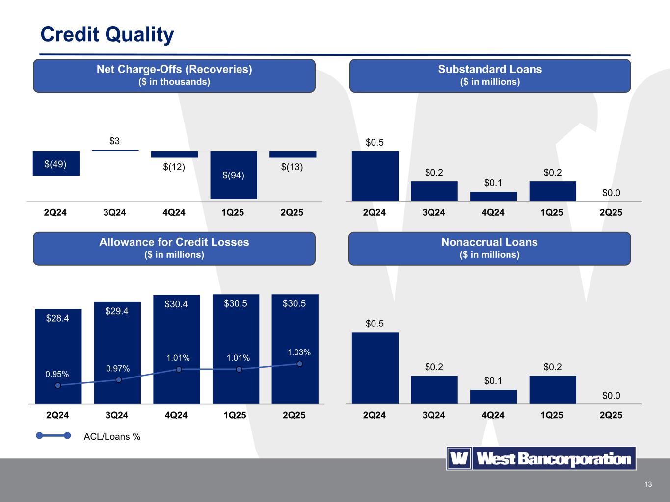13 $(49) $3 $(12) $(94) $(13) 2Q24 3Q24 4Q24 1Q25 2Q25 Credit Quality $0.5 $0.2 $0.1 $0.2 $0.0 2Q24 3Q24 4Q24 1Q25 2Q25 $0.5 $0.2 $0.1 $0.2 $0.0 2Q24 3Q24 4Q24 1Q25 2Q25 $28.4 $29.4 $30.4 $30.5 $30.5 2Q24 3Q24 4Q24 1Q25 2Q25 Net Charge-Offs (Recoveries) ($ in thousands) Substandard Loans ($ in millions) Nonaccrual Loans ($ in millions) Allowance for Credit Losses ($ in millions) 0.95% 0.97% 1.01% 1.01% 1.03% ACL/Loans %