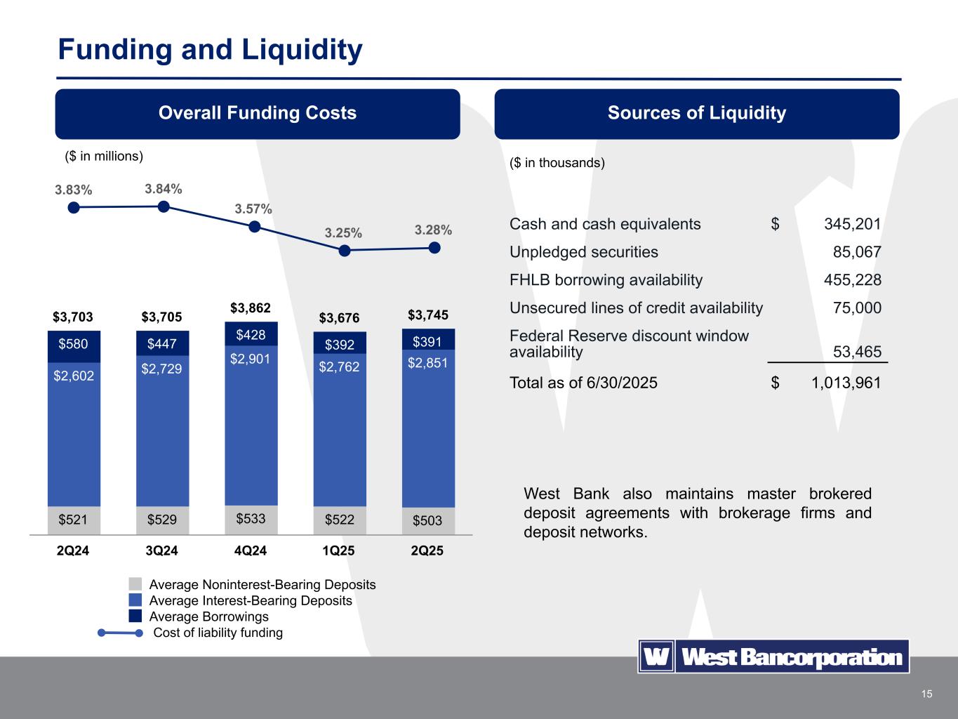 14 Deposits • Total deposits increased $67.5 million in Q2 2025. • Brokered deposits decreased $127.2 million in Q2 2025. • Deposit costs increased 4 bps in Q2 2025 compared to Q1 2025, due to the growth in average balances primarily attributable to higher cost core deposits. • West Bank participates in a reciprocal deposit network which enables depositors to receive FDIC insurance coverage on deposits otherwise exceeding the maximum insurable amount. • Estimated uninsured deposits, excluding deposits in a reciprocal deposit network, brokered deposits and public funds protected by state programs, were approximately 27.2% of total deposits at the end of Q2. Quarterly Highlights $3,123 $3,259 $3,434 $3,284 $3,354 $3,325 $3,392 2Q24 3Q24 4Q24 1Q25 2Q25 1Q25 2Q25 Average Balances Deposit Cost % Period End Deposits ($ in millions) 3.70% 3.80% 3.53% 3.15% 3.19% Brokered Deposits, 6% Noninterest- Bearing, 15% Interest-Bearing Demand, 14% Savings and Money Market, 52% Time Deposits, 13% Deposit Mix as of June 30, 2025