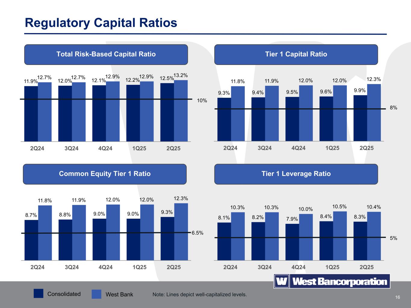 15 Funding and Liquidity Cost of liability funding ($ in thousands) Cash and cash equivalents $ 345,201 Unpledged securities 85,067 FHLB borrowing availability 455,228 Unsecured lines of credit availability 75,000 Federal Reserve discount window availability 53,465 Total as of 6/30/2025 $ 1,013,961 $3,703 $3,705 $3,862 $3,676 $3,745 $521 $529 $533 $522 $503 $2,602 $2,729 $2,901 $2,762 $2,851 $580 $447 $428 $392 $391 Average Noninterest-Bearing Deposits Average Interest-Bearing Deposits Average Borrowings 2Q24 3Q24 4Q24 1Q25 2Q25 3.83% 3.84% 3.57% 3.25% 3.28% Overall Funding Costs Sources of Liquidity West Bank also maintains master brokered deposit agreements with brokerage firms and deposit networks. ($ in millions)