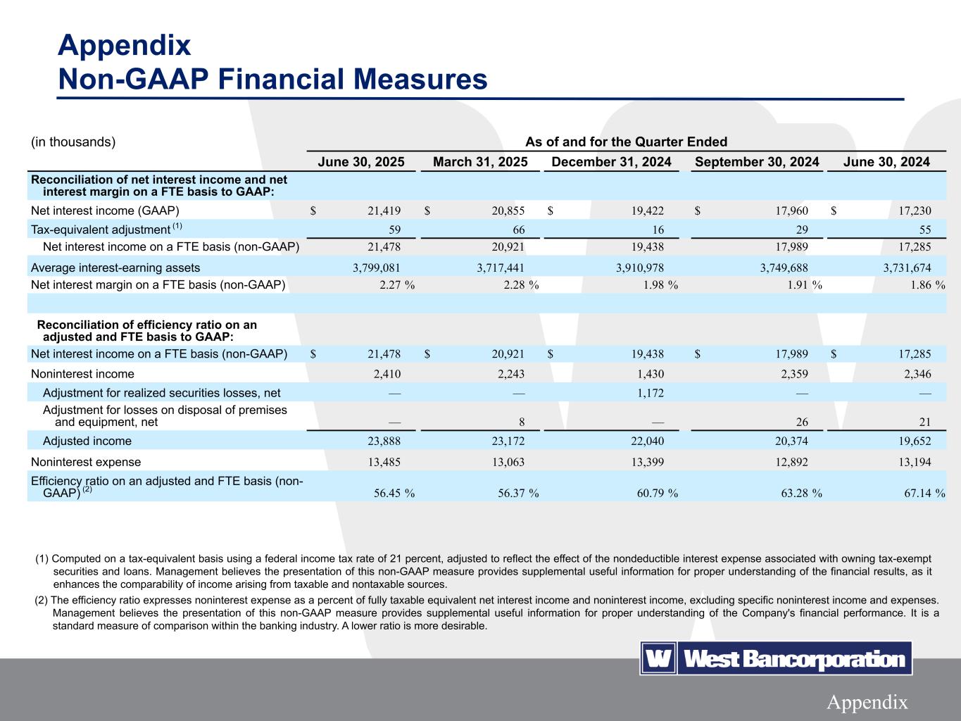 17Appendix Appendix Non-GAAP Financial Measures (in thousands) As of and for the Quarter Ended June 30, 2025 March 31, 2025 December 31, 2024 September 30, 2024 June 30, 2024 Reconciliation of net interest income and net interest margin on a FTE basis to GAAP: Net interest income (GAAP) $ 21,419 $ 20,855 $ 19,422 $ 17,960 $ 17,230 Tax-equivalent adjustment (1) 59 66 16 29 55 Net interest income on a FTE basis (non-GAAP) 21,478 20,921 19,438 17,989 17,285 Average interest-earning assets 3,799,081 3,717,441 3,910,978 3,749,688 3,731,674 Net interest margin on a FTE basis (non-GAAP) 2.27 % 2.28 % 1.98 % 1.91 % 1.86 % Reconciliation of efficiency ratio on an adjusted and FTE basis to GAAP: Net interest income on a FTE basis (non-GAAP) $ 21,478 $ 20,921 $ 19,438 $ 17,989 $ 17,285 Noninterest income 2,410 2,243 1,430 2,359 2,346 Adjustment for realized securities losses, net — — 1,172 — — Adjustment for losses on disposal of premises and equipment, net — 8 — 26 21 Adjusted income 23,888 23,172 22,040 20,374 19,652 Noninterest expense 13,485 13,063 13,399 12,892 13,194 Efficiency ratio on an adjusted and FTE basis (non- GAAP) (2) 56.45 % 56.37 % 60.79 % 63.28 % 67.14 % (1) Computed on a tax-equivalent basis using a federal income tax rate of 21 percent, adjusted to reflect the effect of the nondeductible interest expense associated with owning tax-exempt securities and loans. Management believes the presentation of this non-GAAP measure provides supplemental useful information for proper understanding of the financial results, as it enhances the comparability of income arising from taxable and nontaxable sources. (2) The efficiency ratio expresses noninterest expense as a percent of fully taxable equivalent net interest income and noninterest income, excluding specific noninterest income and expenses. Management believes the presentation of this non-GAAP measure provides supplemental useful information for proper understanding of the Company's financial performance. It is a standard measure of comparison within the banking industry. A lower ratio is more desirable.