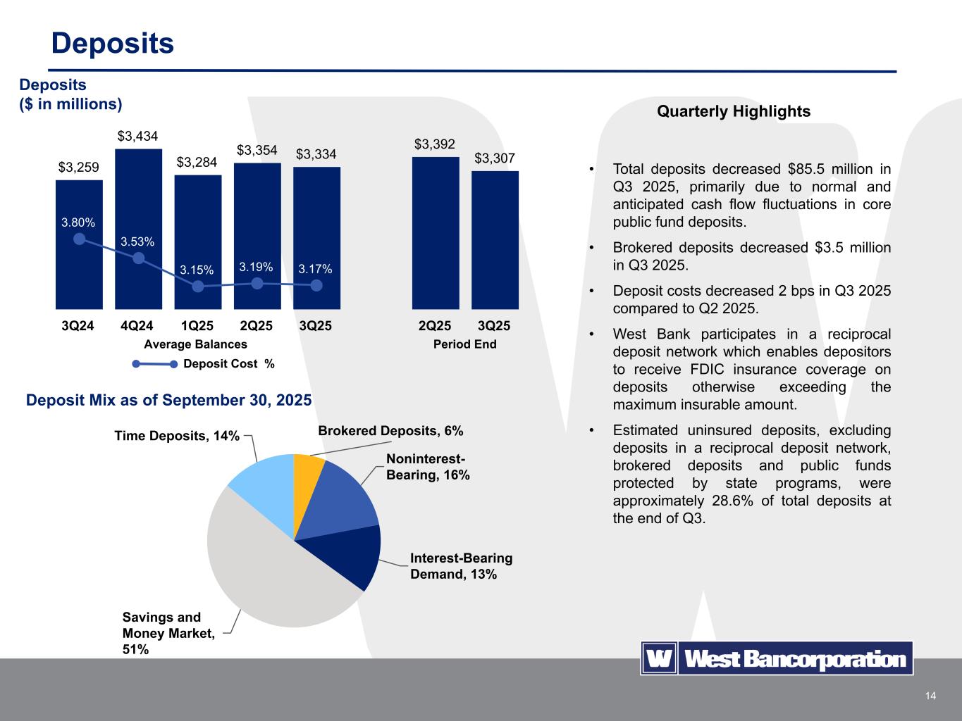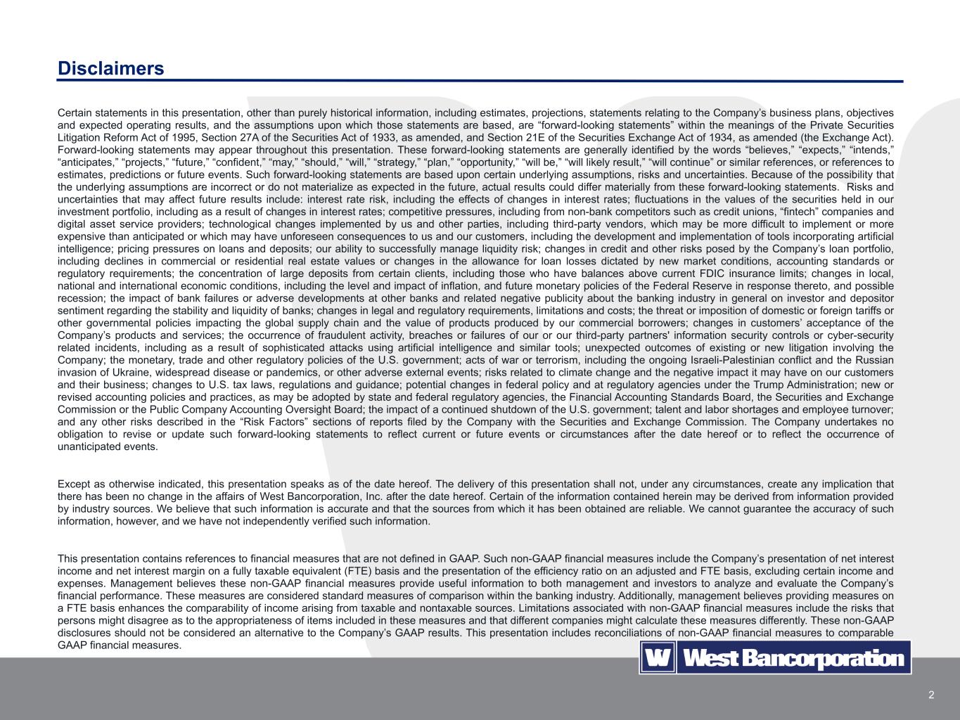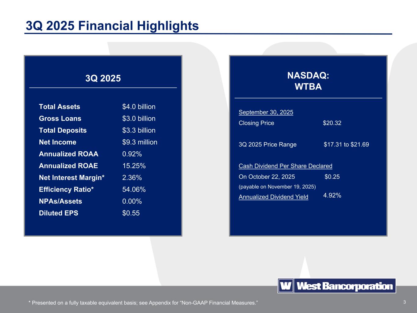 2 Certain statements in this presentation, other than purely historical information, including estimates, projections, statements relating to the Company’s business plans, objectives and expected operating results, and the assumptions upon which those statements are based, are “forward-looking statements” within the meanings of the Private Securities Litigation Reform Act of 1995, Section 27A of the Securities Act of 1933, as amended, and Section 21E of the Securities Exchange Act of 1934, as amended (the Exchange Act). Forward-looking statements may appear throughout this presentation. These forward-looking statements are generally identified by the words “believes,” “expects,” “intends,” “anticipates,” “projects,” “future,” “confident,” “may,” “should,” “will,” “strategy,” “plan,” “opportunity,” “will be,” “will likely result,” “will continue” or similar references, or references to estimates, predictions or future events. Such forward-looking statements are based upon certain underlying assumptions, risks and uncertainties. Because of the possibility that the underlying assumptions are incorrect or do not materialize as expected in the future, actual results could differ materially from these forward-looking statements. Risks and uncertainties that may affect future results include: interest rate risk, including the effects of changes in interest rates; fluctuations in the values of the securities held in our investment portfolio, including as a result of changes in interest rates; competitive pressures, including from non-bank competitors such as credit unions, “fintech” companies and digital asset service providers; technological changes implemented by us and other parties, including third-party vendors, which may be more difficult to implement or more expensive than anticipated or which may have unforeseen consequences to us and our customers, including the development and implementation of tools incorporating artificial intelligence; pricing pressures on loans and deposits; our ability to successfully manage liquidity risk; changes in credit and other risks posed by the Company’s loan portfolio, including declines in commercial or residential real estate values or changes in the allowance for loan losses dictated by new market conditions, accounting standards or regulatory requirements; the concentration of large deposits from certain clients, including those who have balances above current FDIC insurance limits; changes in local, national and international economic conditions, including the level and impact of inflation, and future monetary policies of the Federal Reserve in response thereto, and possible recession; the impact of bank failures or adverse developments at other banks and related negative publicity about the banking industry in general on investor and depositor sentiment regarding the stability and liquidity of banks; changes in legal and regulatory requirements, limitations and costs; the threat or imposition of domestic or foreign tariffs or other governmental policies impacting the global supply chain and the value of products produced by our commercial borrowers; changes in customers’ acceptance of the Company’s products and services; the occurrence of fraudulent activity, breaches or failures of our or our third-party partners' information security controls or cyber-security related incidents, including as a result of sophisticated attacks using artificial intelligence and similar tools; unexpected outcomes of existing or new litigation involving the Company; the monetary, trade and other regulatory policies of the U.S. government; acts of war or terrorism, including the ongoing Israeli-Palestinian conflict and the Russian invasion of Ukraine, widespread disease or pandemics, or other adverse external events; risks related to climate change and the negative impact it may have on our customers and their business; changes to U.S. tax laws, regulations and guidance; potential changes in federal policy and at regulatory agencies under the Trump Administration; new or revised accounting policies and practices, as may be adopted by state and federal regulatory agencies, the Financial Accounting Standards Board, the Securities and Exchange Commission or the Public Company Accounting Oversight Board; the impact of a continued shutdown of the U.S. government; talent and labor shortages and employee turnover; and any other risks described in the “Risk Factors” sections of reports filed by the Company with the Securities and Exchange Commission. The Company undertakes no obligation to revise or update such forward-looking statements to reflect current or future events or circumstances after the date hereof or to reflect the occurrence of unanticipated events. Except as otherwise indicated, this presentation speaks as of the date hereof. The delivery of this presentation shall not, under any circumstances, create any implication that there has been no change in the affairs of West Bancorporation, Inc. after the date hereof. Certain of the information contained herein may be derived from information provided by industry sources. We believe that such information is accurate and that the sources from which it has been obtained are reliable. We cannot guarantee the accuracy of such information, however, and we have not independently verified such information. This presentation contains references to financial measures that are not defined in GAAP. Such non-GAAP financial measures include the Company’s presentation of net interest income and net interest margin on a fully taxable equivalent (FTE) basis and the presentation of the efficiency ratio on an adjusted and FTE basis, excluding certain income and expenses. Management believes these non-GAAP financial measures provide useful information to both management and investors to analyze and evaluate the Company’s financial performance. These