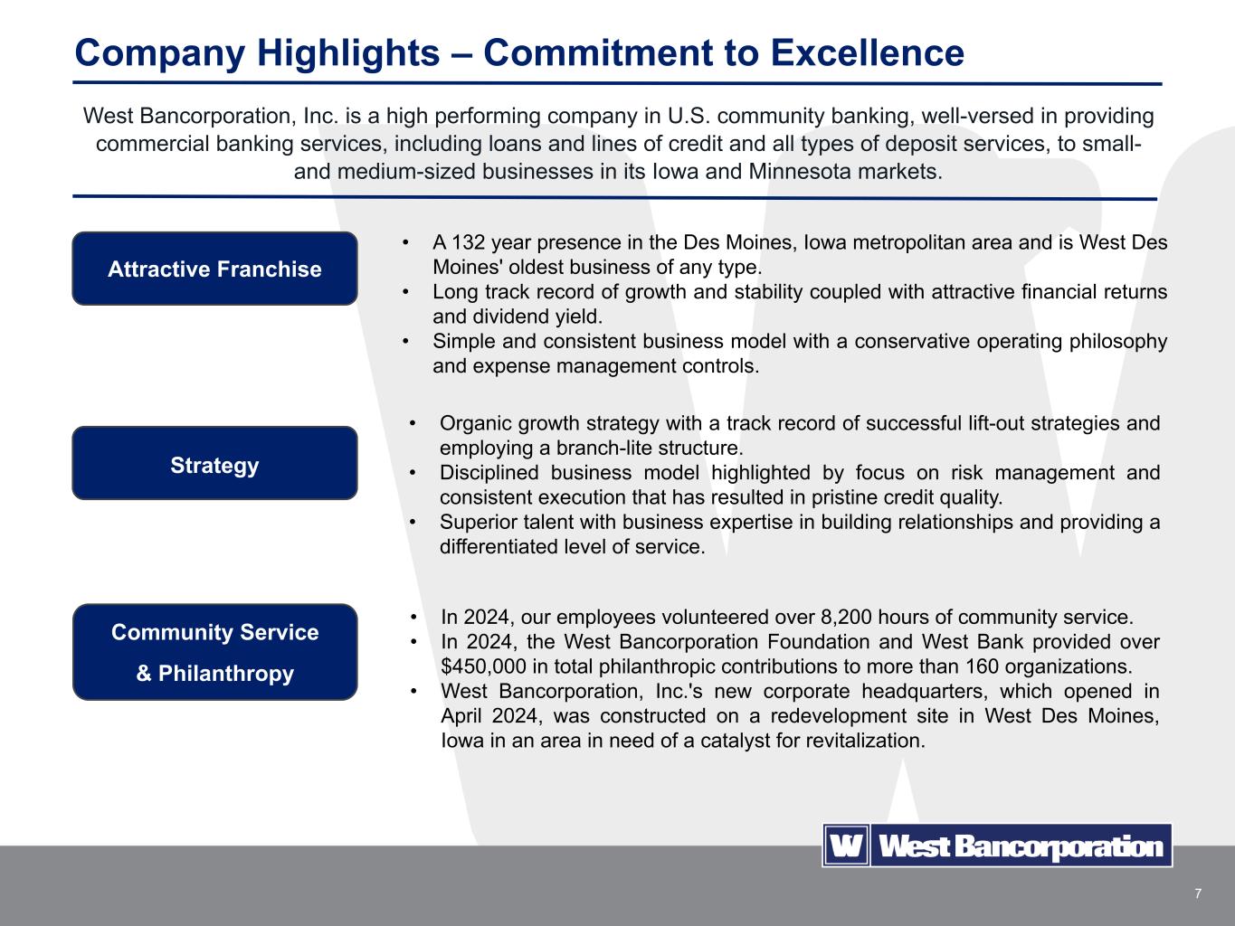 6 Conservative Organic Growth with Successful Lift-Out Strategies David Nelson joins West Bancorporation, Inc. as CEO. Entered the Rochester, Minnesota market by hiring experienced bankers who had existing strong relationships with local business owners and creating an advisory community board made up of local business owners and leaders. Successful and profitable establishment of market presence led to construction of permanent commercial banking office in 2016. Reached $2 billion in total assets. Expanded into St. Cloud, Mankato, and Owatonna, Minnesota with the same lift- out strategy used in Rochester, Minnesota. Successful and profitable establishment of market presence led to construction of permanent commercial banking offices in each of these three markets during 2022-2025. Reached $3 billion in total assets. Opened new corporate headquarters building in West Des Moines, Iowa in April 2024. After being in the same leased space for fifty years, the new building consolidates the organization's operations under one roof, and provides space for future growth and enhanced business development opportunities. Reached $4 billion in total assets. 2010 2013 2018 2019 2020 2024 2024