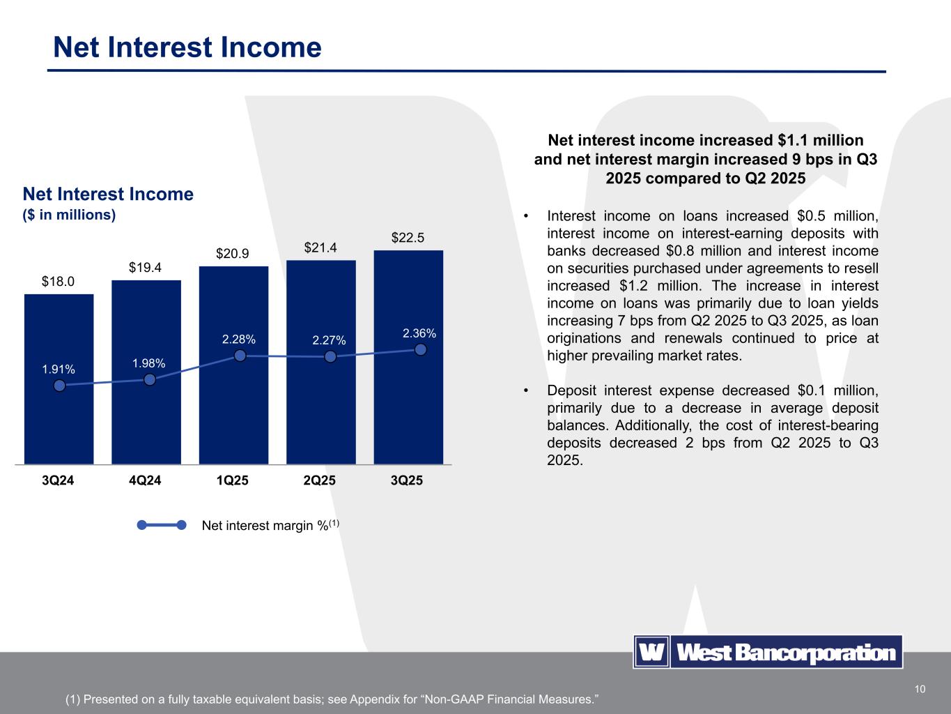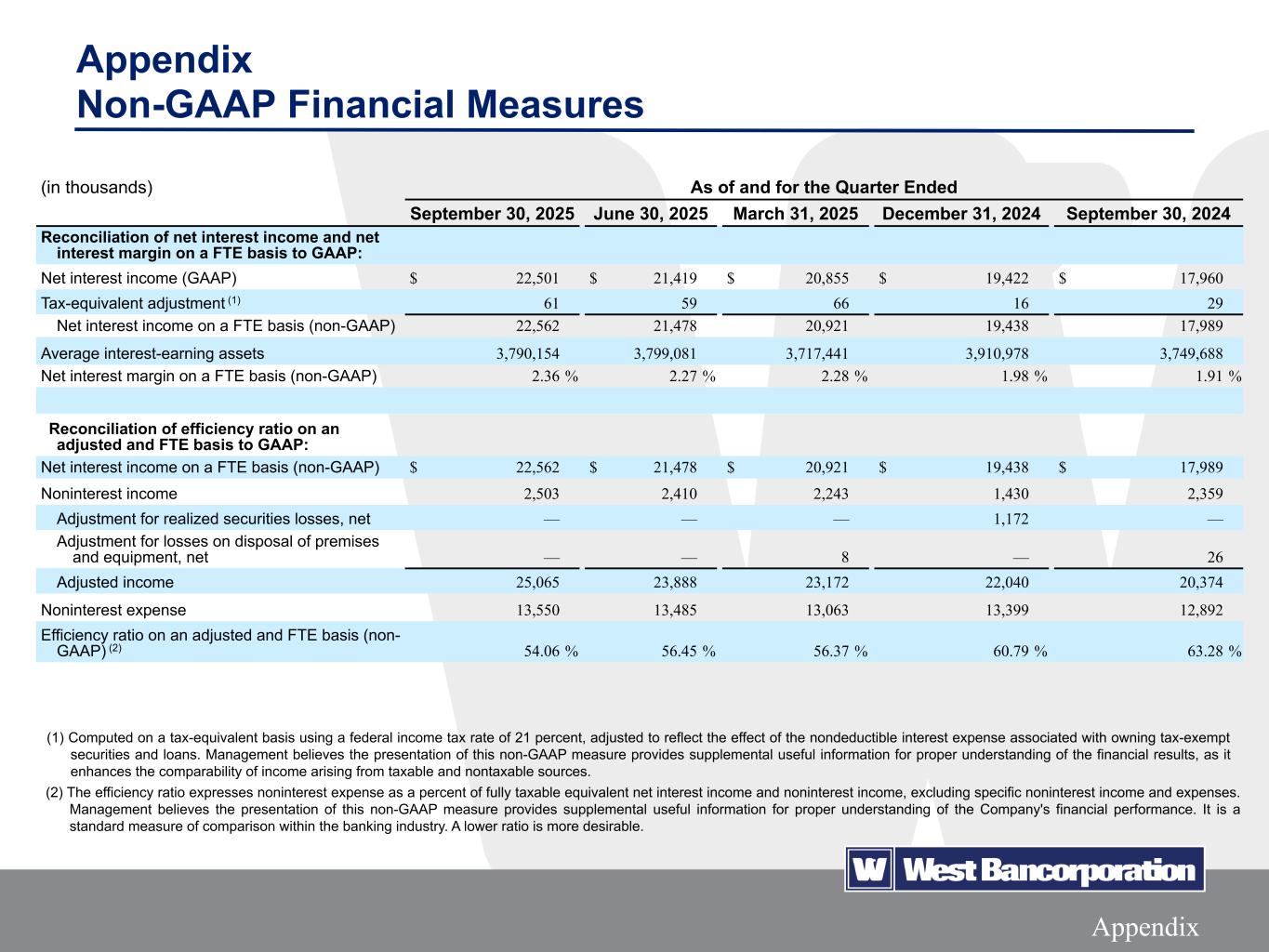 17Appendix Appendix Non-GAAP Financial Measures (in thousands) As of and for the Quarter Ended September 30, 2025 June 30, 2025 March 31, 2025 December 31, 2024 September 30, 2024 Reconciliation of net interest income and net interest margin on a FTE basis to GAAP: Net interest income (GAAP) $ 22,501 $ 21,419 $ 20,855 $ 19,422 $ 17,960 Tax-equivalent adjustment (1) 61 59 66 16 29 Net interest income on a FTE basis (non-GAAP) 22,562 21,478 20,921 19,438 17,989 Average interest-earning assets 3,790,154 3,799,081 3,717,441 3,910,978 3,749,688 Net interest margin on a FTE basis (non-GAAP) 2.36 % 2.27 % 2.28 % 1.98 % 1.91 % Reconciliation of efficiency ratio on an adjusted and FTE basis to GAAP: Net interest income on a FTE basis (non-GAAP) $ 22,562 $ 21,478 $ 20,921 $ 19,438 $ 17,989 Noninterest income 2,503 2,410 2,243 1,430 2,359 Adjustment for realized securities losses, net — — — 1,172 — Adjustment for losses on disposal of premises and equipment, net — — 8 — 26 Adjusted income 25,065 23,888 23,172 22,040 20,374 Noninterest expense 13,550 13,485 13,063 13,399 12,892 Efficiency ratio on an adjusted and FTE basis (non- GAAP) (2) 54.06 % 56.45 % 56.37 % 60.79 % 63.28 % (1) Computed on a tax-equivalent basis using a federal income tax rate of 21 percent, adjusted to reflect the effect of the nondeductible interest expense associated with owning tax-exempt securities and loans. Management believes the presentation of this non-GAAP measure provides supplemental useful information for proper understanding of the financial results, as it enhances the comparability of income arising from taxable and nontaxable sources. (2) The efficiency ratio expresses noninterest expense as a percent of fully taxable equivalent net interest income and noninterest income, excluding specific noninterest income and expenses. Management believes the presentation of this non-GAAP measure provides supplemental useful information for proper understanding of the Company's financial performance. It is a standard measure of comparison within the banking industry. A lower ratio is more desirable.