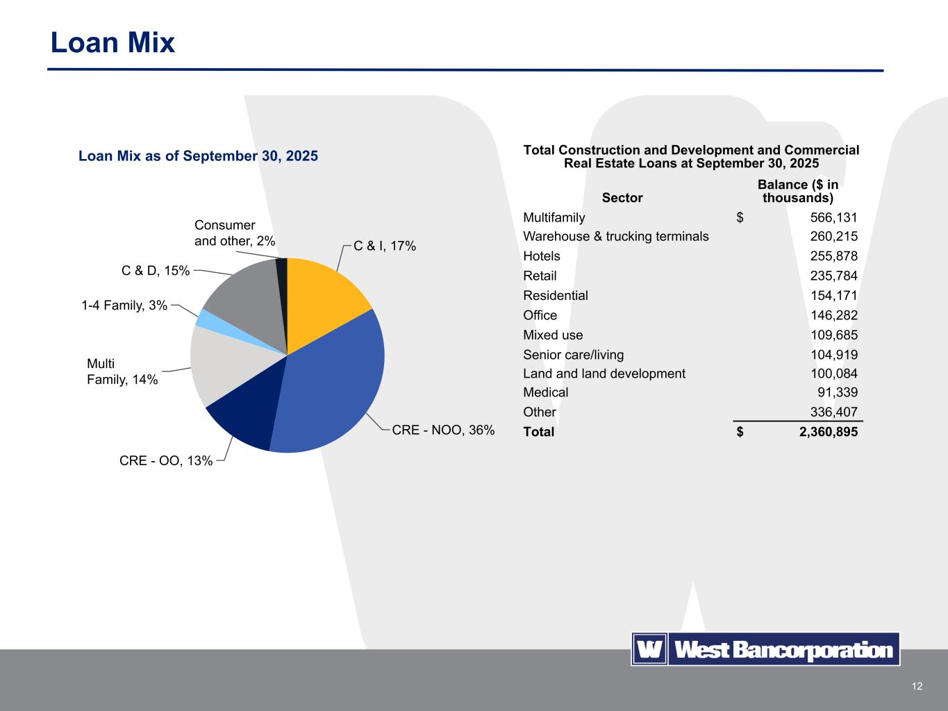 11 $2,991 $3,008 $3,016 $2,990 $2,960 $2,966 $3,009 3Q24 4Q24 1Q25 2Q25 3Q25 2Q25 3Q25 Loans • Loans increased $42.5 million in Q3 2025, primarily due to an increase in commercial loans and commercial real estate loans. • Quarterly average loans decreased $29.7 million compared to Q2 2025. • Commercial real estate loans are well diversified among various industry sectors. • Loan yields increased 7 bps in Q3 2025 compared to Q2 2025 as loan originations and renewals continued to price at higher prevailing market rates. • 40% of the loan portfolio consists of variable-rate loans. Quarterly Highlights 5.65% 5.53% 5.52% 5.59% 5.66% Loans ($ in millions) Average Balances Period End Loan Yield %