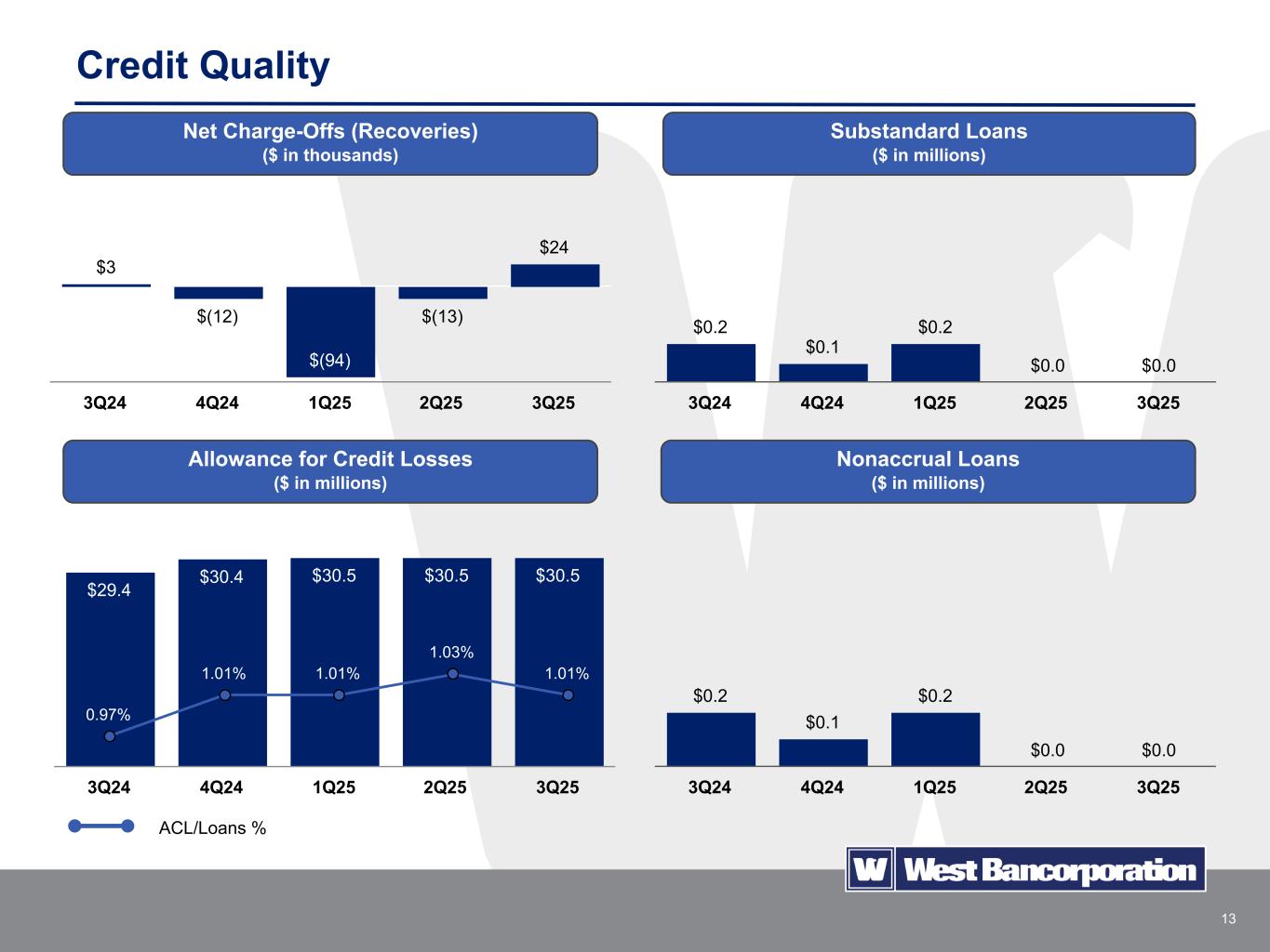 13 $3 $(12) $(94) $(13) $24 3Q24 4Q24 1Q25 2Q25 3Q25 Credit Quality $0.2 $0.1 $0.2 $0.0 $0.0 3Q24 4Q24 1Q25 2Q25 3Q25 $0.2 $0.1 $0.2 $0.0 $0.0 3Q24 4Q24 1Q25 2Q25 3Q25 $29.4 $30.4 $30.5 $30.5 $30.5 3Q24 4Q24 1Q25 2Q25 3Q25 Net Charge-Offs (Recoveries) ($ in thousands) Substandard Loans ($ in millions) Nonaccrual Loans ($ in millions) Allowance for Credit Losses ($ in millions) 0.97% 1.01% 1.01% 1.03% 1.01% ACL/Loans %