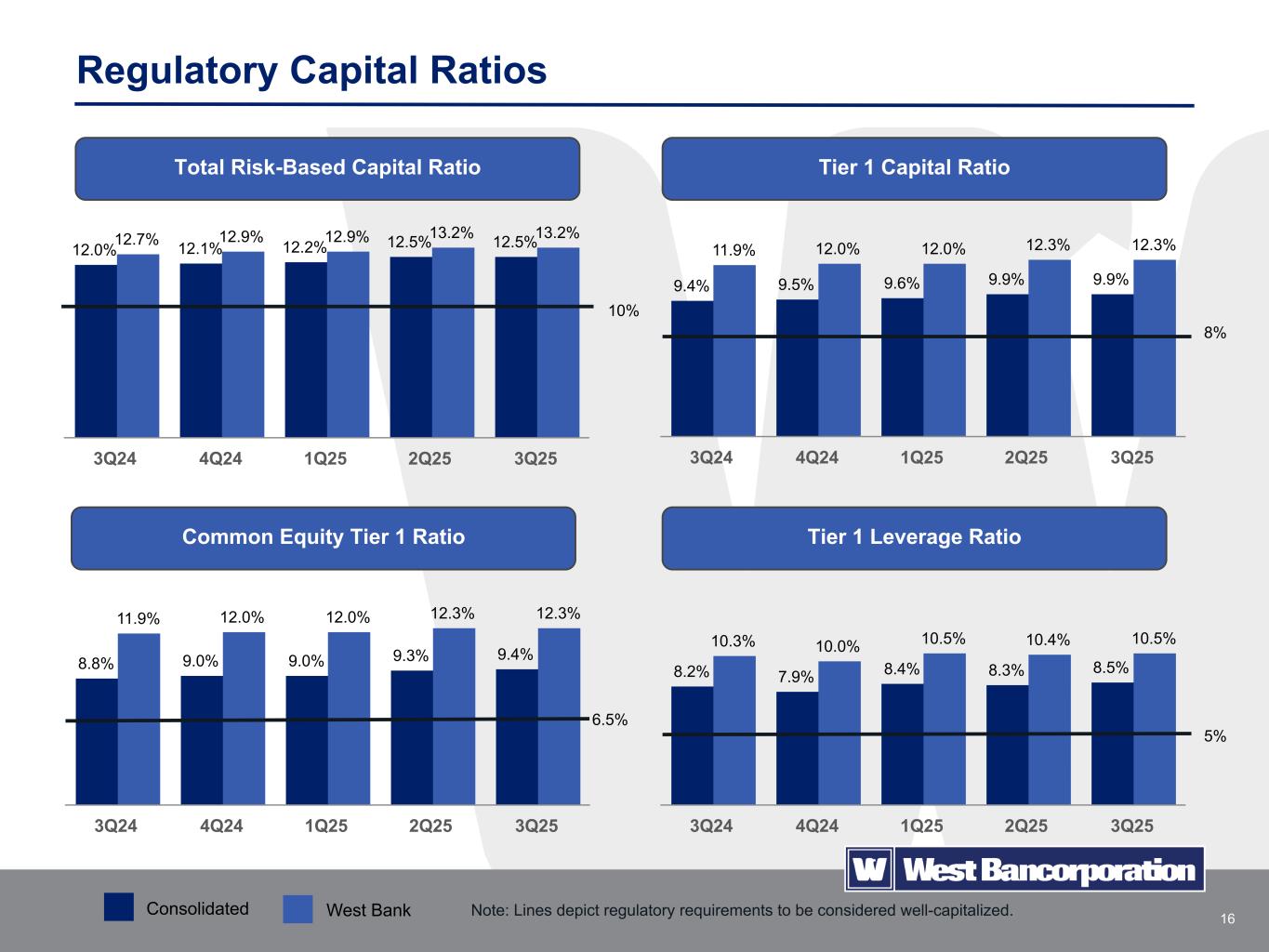 15 Funding and Liquidity Cost of liability funding ($ in thousands) Cash and cash equivalents $ 232,932 Unpledged securities 84,276 FHLB borrowing availability 544,728 Unsecured lines of credit availability 75,000 Federal Reserve discount window availability 53,070 Total as of 9/30/2025 $ 990,006 $3,705 $3,862 $3,676 $3,745 $3,723 $529 $533 $522 $503 $512 $2,729 $2,901 $2,762 $2,851 $2,822 $447 $428 $392 $391 $389 Average Noninterest-Bearing Deposits Average Interest-Bearing Deposits Average Borrowings 3Q24 4Q24 1Q25 2Q25 3Q25 3.84% 3.57% 3.25% 3.28% 3.26% Overall Funding Costs Sources of Liquidity West Bank also maintains master brokered deposit agreements with brokerage firms and deposit networks. ($ in millions)