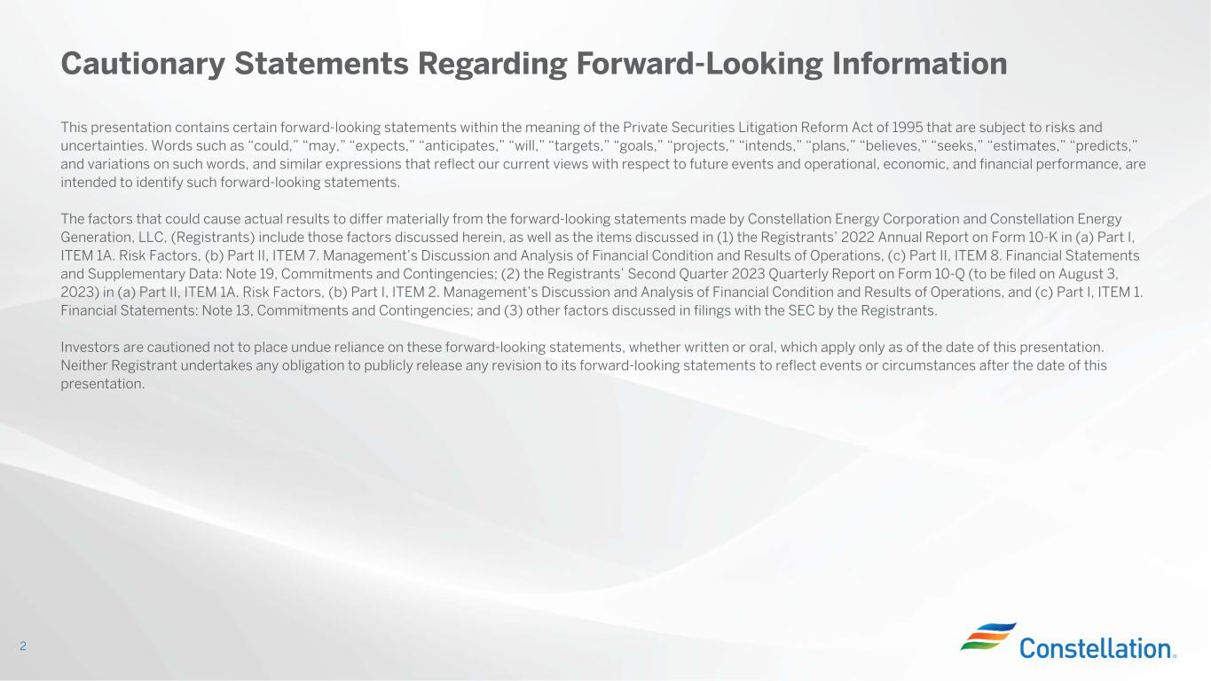 This presentation contains certain forward-looking statements within the meaning of the Private Securities Litigation Reform Act of 1995 that are subject to risks and uncertainties. Words such as “could,” “may,” “expects,” “anticipates,” “will,” “targets,” “goals,” “projects,” “intends,” “plans,” “believes,” “seeks,” “estimates,” “predicts,” and variations on such words, and similar expressions that reflect our current views with respect to future events and operational, economic, and financial performance, are intended to identify such forward-looking statements. The factors that could cause actual results to differ materially from the forward-looking statements made by Constellation Energy Corporation and Constellation Energy Generation, LLC, (Registrants) include those factors discussed herein, as well as the items discussed in (1) the Registrants’ 2022 Annual Report on Form 10-K in (a) Part I, ITEM 1A. Risk Factors, (b) Part II, ITEM 7. Management’s Discussion and Analysis of Financial Condition and Results of Operations, (c) Part II, ITEM 8. Financial Statements and Supplementary Data: Note 19, Commitments and Contingencies; (2) the Registrants’ Second Quarter 2023 Quarterly Report on Form 10-Q (to be filed on August 3, 2023) in (a) Part II, ITEM 1A. Risk Factors, (b) Part I, ITEM 2. Management’s Discussion and Analysis of Financial Condition and Results of Operations, and (c) Part I, ITEM 1. Financial Statements: Note 13, Commitments and Contingencies; and (3) other factors discussed in filings with the SEC by the Registrants. Investors are cautioned not to place undue reliance on these forward-looking statements, whether written or oral, which apply only as of the date of this presentation. Neither Registrant undertakes any obligation to publicly release any revision to its forward-looking statements to reflect events or circumstances after the date of this presentation. Cautionary Statements Regarding Forward-Looking Information 2