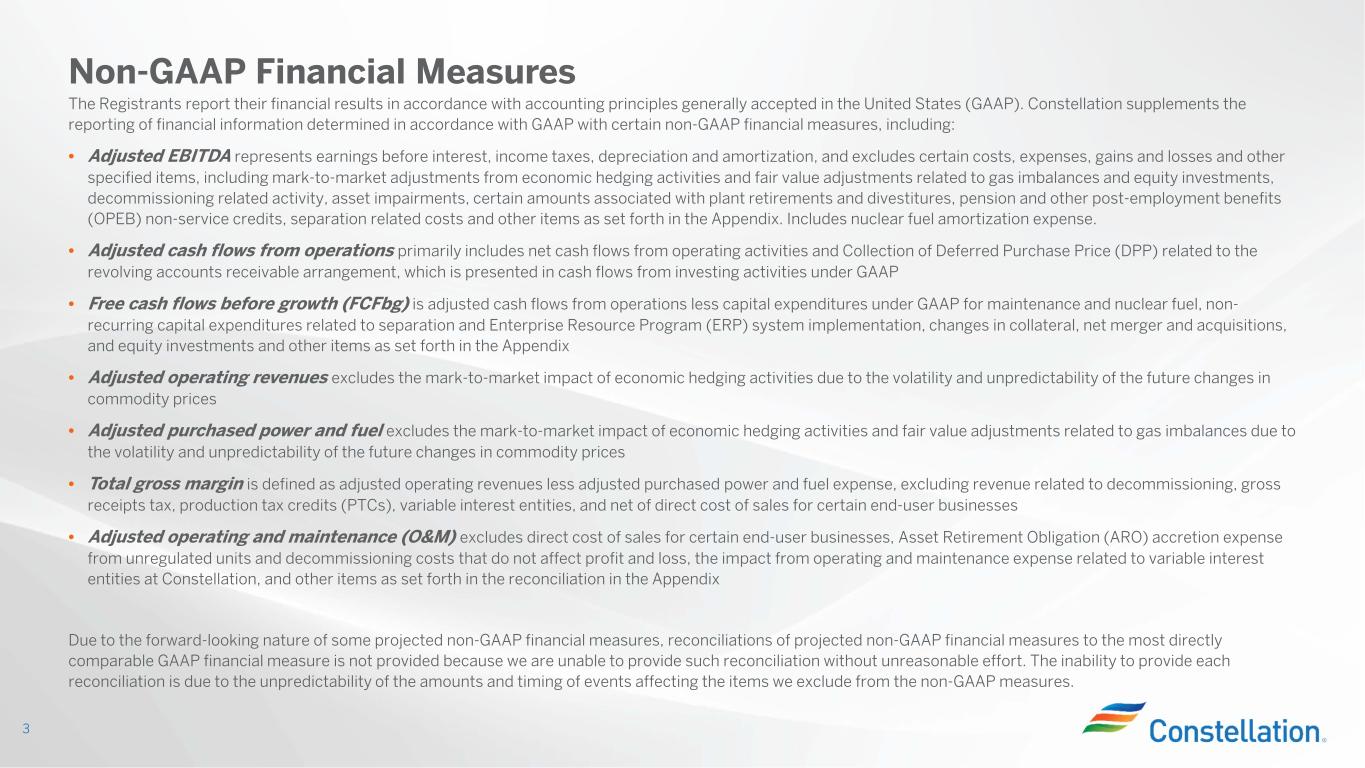 The Registrants report their financial results in accordance with accounting principles generally accepted in the United States (GAAP). Constellation supplements the reporting of financial information determined in accordance with GAAP with certain non-GAAP financial measures, including: • Adjusted EBITDA represents earnings before interest, income taxes, depreciation and amortization, and excludes certain costs, expenses, gains and losses and other specified items, including mark-to-market adjustments from economic hedging activities and fair value adjustments related to gas imbalances and equity investments, decommissioning related activity, asset impairments, certain amounts associated with plant retirements and divestitures, pension and other post-employment benefits (OPEB) non-service credits, separation related costs and other items as set forth in the Appendix. Includes nuclear fuel amortization expense. • Adjusted cash flows from operations primarily includes net cash flows from operating activities and Collection of Deferred Purchase Price (DPP) related to the revolving accounts receivable arrangement, which is presented in cash flows from investing activities under GAAP • Free cash flows before growth (FCFbg) is adjusted cash flows from operations less capital expenditures under GAAP for maintenance and nuclear fuel, non- recurring capital expenditures related to separation and Enterprise Resource Program (ERP) system implementation, changes in collateral, net merger and acquisitions, and equity investments and other items as set forth in the Appendix • Adjusted operating revenues excludes the mark-to-market impact of economic hedging activities due to the volatility and unpredictability of the future changes in commodity prices • Adjusted purchased power and fuel excludes the mark-to-market impact of economic hedging activities and fair value adjustments related to gas imbalances due to the volatility and unpredictability of the future changes in commodity prices • Total gross margin is defined as adjusted operating revenues less adjusted purchased power and fuel expense, excluding revenue related to decommissioning, gross receipts tax, production tax credits (PTCs), variable interest entities, and net of direct cost of sales for certain end-user businesses • Adjusted operating and maintenance (O&M) excludes direct cost of sales for certain end-user businesses, Asset Retirement Obligation (ARO) accretion expense from unregulated units and decommissioning costs that do not affect profit and loss, the impact from operating and maintenance expense related to variable interest entities at Constellation, and other items as set forth in the reconciliation in the Appendix Due to the forward-looking nature of some projected non-GAAP financial measures, reconciliations of projected non-GAAP financial measures to the most directly comparable GAAP financial measure is not provided because we are unable to provide such reconciliation without unreasonable effort. The inability to provide each reconciliation is due to the unpredictability of the amounts and timing of events affecting the items we exclude from the non-GAAP measures. Non-GAAP Financial Measures 3