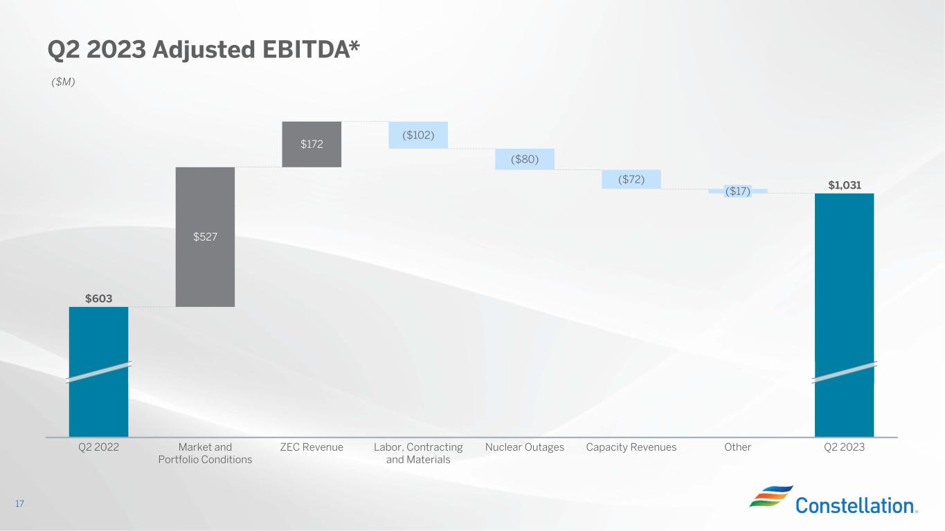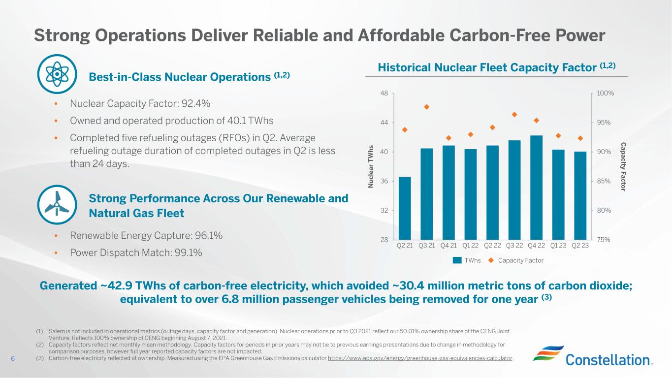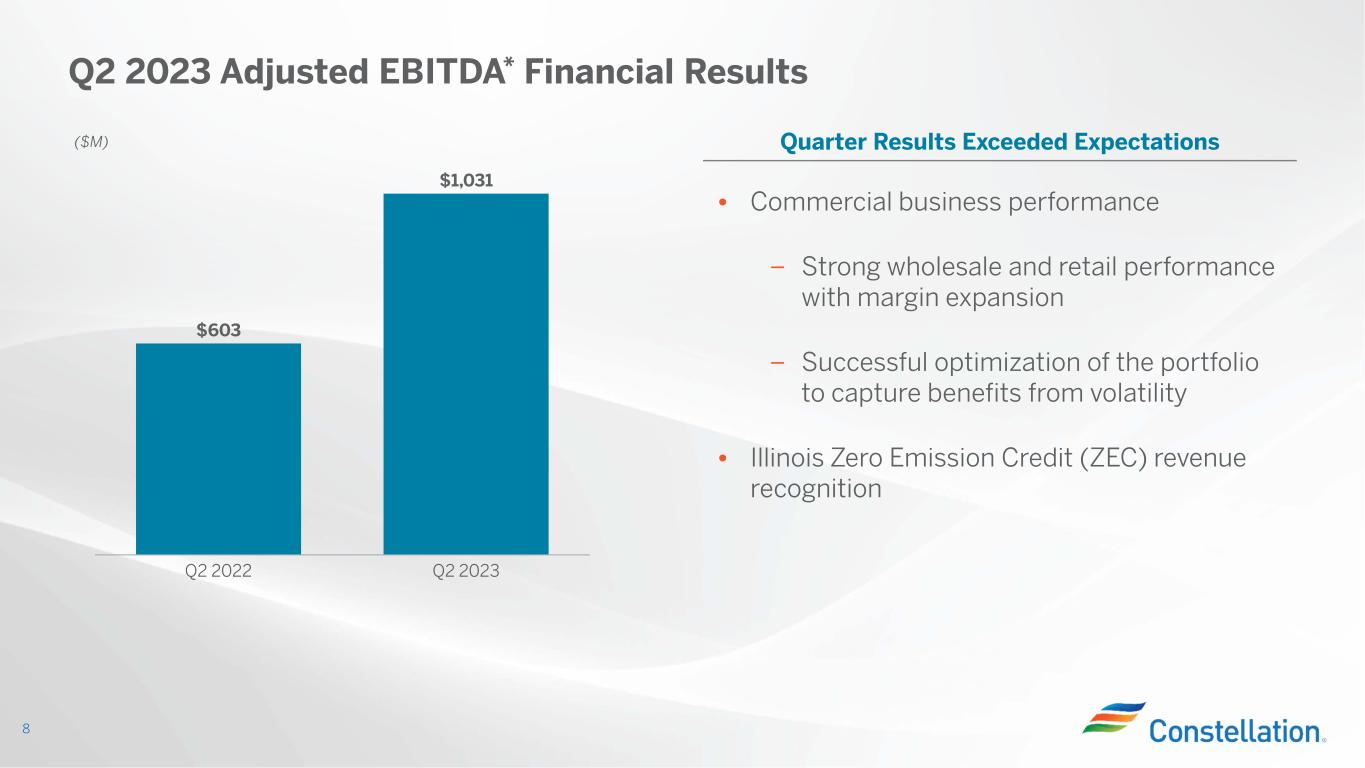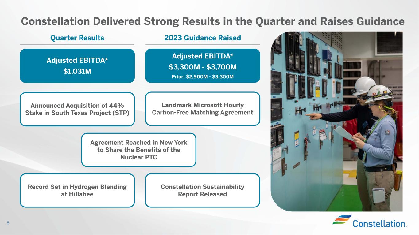 Constellation Delivered Strong Results in the Quarter and Raises Guidance 5 Quarter Results Adjusted EBITDA* $1,031M 2023 Guidance Raised Adjusted EBITDA* $3,300M - $3,700M Prior: $2,900M - $3,300M Agreement Reached in New York to Share the Benefits of the Nuclear PTC Landmark Microsoft Hourly Carbon-Free Matching Agreement Announced Acquisition of 44% Stake in South Texas Project (STP) Constellation Sustainability Report Released Record Set in Hydrogen Blending at Hillabee