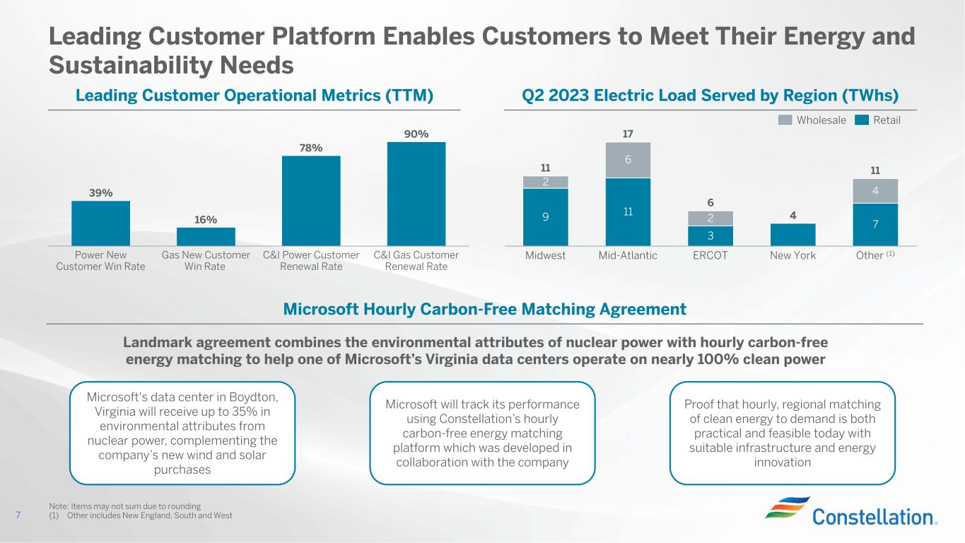 Best-in-Class Nuclear Operations (1,2) • Nuclear Capacity Factor: 92.4% • Owned and operated production of 40.1 TWhs • Completed five refueling outages (RFOs) in Q2. Average refueling outage duration of completed outages in Q2 is less than 24 days. 6 Strong Operations Deliver Reliable and Affordable Carbon-Free Power (1) Salem is not included in operational metrics (outage days, capacity factor and generation). Nuclear operations prior to Q3 2021 reflect our 50.01% ownership share of the CENG Joint Venture. Reflects 100% ownership of CENG beginning August 7, 2021. (2) Capacity factors reflect net monthly mean methodology. Capacity factors for periods in prior years may not tie to previous earnings presentations due to change in methodology for comparison purposes, however full year reported capacity factors are not impacted. (3) Carbon-free electricity reflected at ownership. Measured using the EPA Greenhouse Gas Emissions calculator https://www.epa.gov/energy/greenhouse-gas-equivalencies-calculator. 75% 80% 85% 90% 95% 100% 28 32 36 40 44 48 N u cl ea r T W h s Q1 22 C ap acity F acto r Q2 21 Q3 21 Q4 21 Q2 22 Q3 22 Q4 22 Q2 23Q1 23 TWhs Capacity Factor Generated ~42.9 TWhs of carbon-free electricity, which avoided ~30.4 million metric tons of carbon dioxide; equivalent to over 6.8 million passenger vehicles being removed for one year (3) Strong Performance Across Our Renewable and Natural Gas Fleet • Renewable Energy Capture: 96.1% • Power Dispatch Match: 99.1% Historical Nuclear Fleet Capacity Factor (1,2)