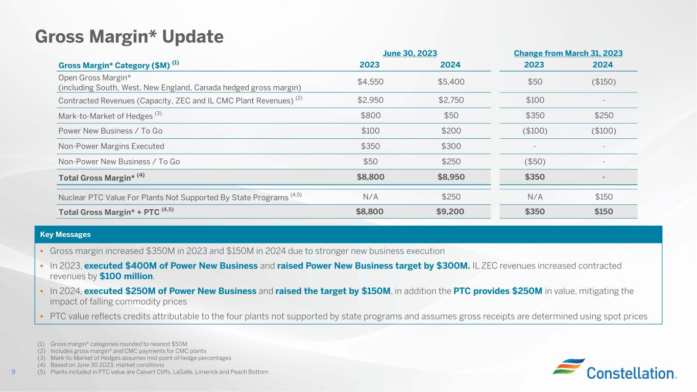 Q2 2023 Adjusted EBITDA* Financial Results 8 Quarter Results Exceeded Expectations $603 $1,031 Q2 2023Q2 2022 ($M) • Commercial business performance – Strong wholesale and retail performance with margin expansion – Successful optimization of the portfolio to capture benefits from volatility • Illinois Zero Emission Credit (ZEC) revenue recognition