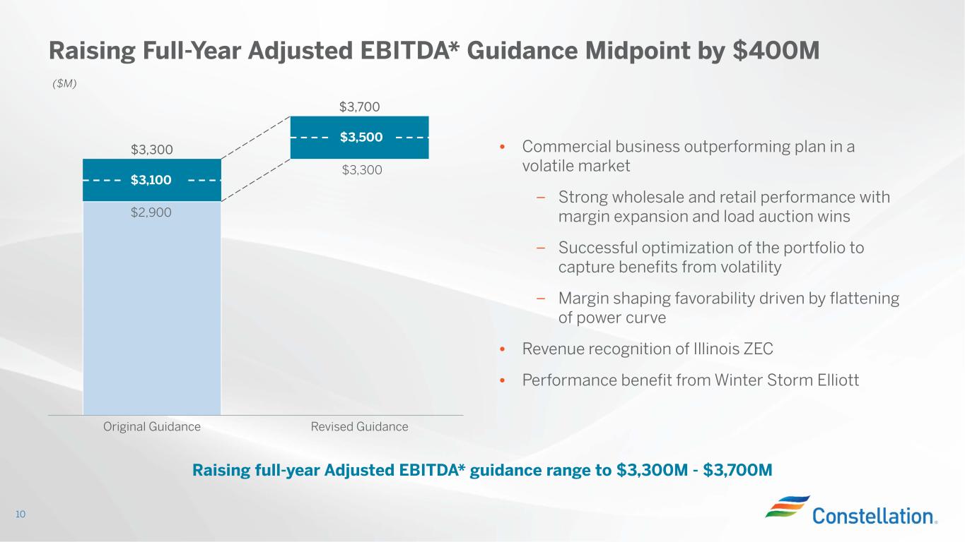 Gross Margin* Category ($M) (1) 2023 2024 2023 2024 Open Gross Margin* (including South, West, New England, Canada hedged gross margin) $4,550 $5,400 $50 ($150) Contracted Revenues (Capacity, ZEC and IL CMC Plant Revenues) (2) $2,950 $2,750 $100 - Mark-to-Market of Hedges (3) $800 $50 $350 $250 Power New Business / To Go $100 $200 ($100) ($100) Non-Power Margins Executed $350 $300 - - Non-Power New Business / To Go $50 $250 ($50) - Total Gross Margin* (4) $8,800 $8,950 $350 - Nuclear PTC Value For Plants Not Supported By State Programs (4,5) N/A $250 N/A $150 Total Gross Margin* + PTC (4,5) $8,800 $9,200 $350 $150 June 30, 2023 Change from March 31, 2023 Gross Margin* Update 9 (1) Gross margin* categories rounded to nearest $50M (2) Includes gross margin* and CMC payments for CMC plants (3) Mark-to-Market of Hedges assumes mid-point of hedge percentages (4) Based on June 30 2023, market conditions (5) Plants included in PTC value are Calvert Cliffs, LaSalle, Limerick and Peach Bottom Key Messages • Gross margin increased $350M in 2023 and $150M in 2024 due to stronger new business execution • In 2023, executed $400M of Power New Business and raised Power New Business target by $300M. IL ZEC revenues increased contracted revenues by $100 million. • In 2024, executed $250M of Power New Business and raised the target by $150M, in addition the PTC provides $250M in value, mitigating the impact of falling commodity prices • PTC value reflects credits attributable to the four plants not supported by state programs and assumes gross receipts are determined using spot prices